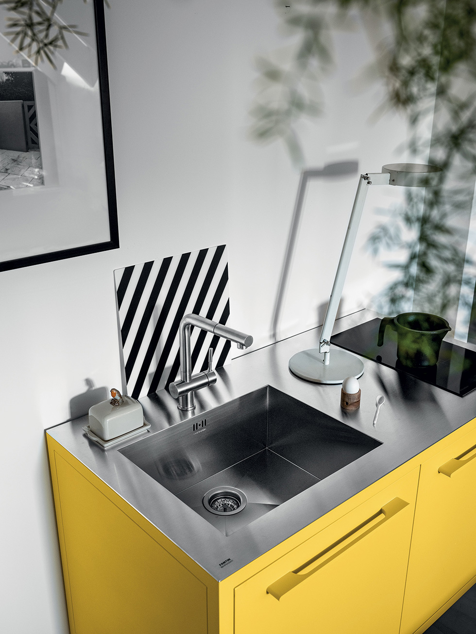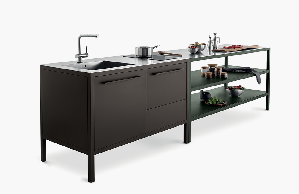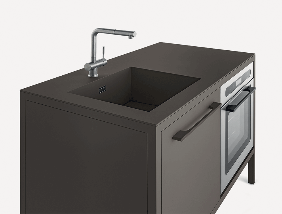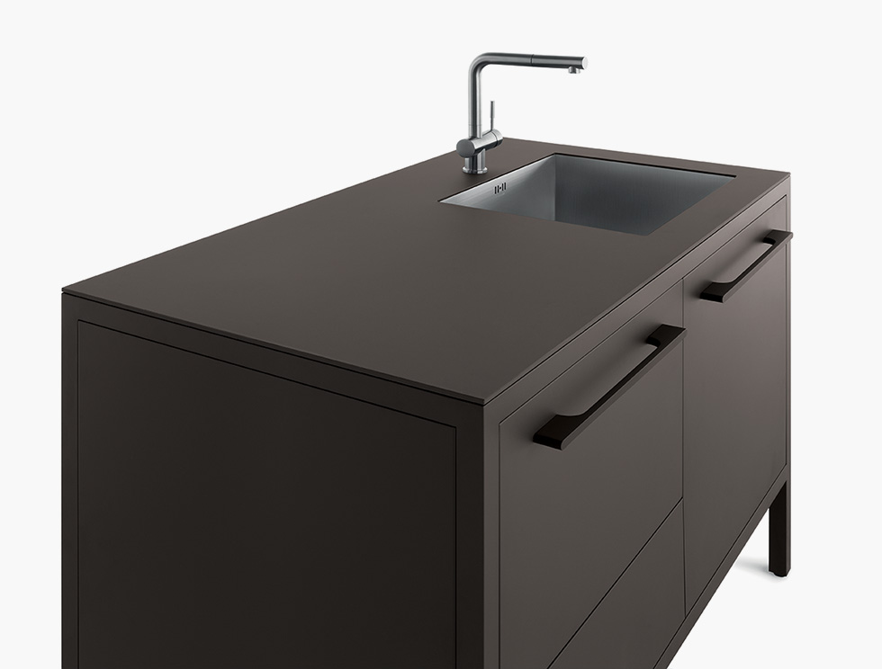 Le cucine Frame sono proposte a 2 o 3 moduli, con top in acciaio Barazza o in Fenix NTM. L’acciaio – in finitura Vintage o satinata da 4 mm – è abbinabile con tutte le finiture Fantin, mentre i top in Fenix NTM sono proposti con telai nelle finiture Ultra-matt perché esattamente corrispondenti per colore, opacità e morbidezza al tatto. è così possibile ottenere cucine monocromatiche dalle solide strutture in metallo Fantin e con top resistenti e ripristinabili.