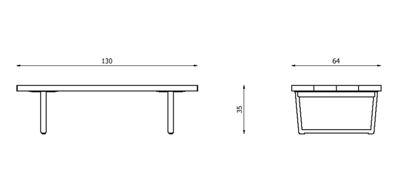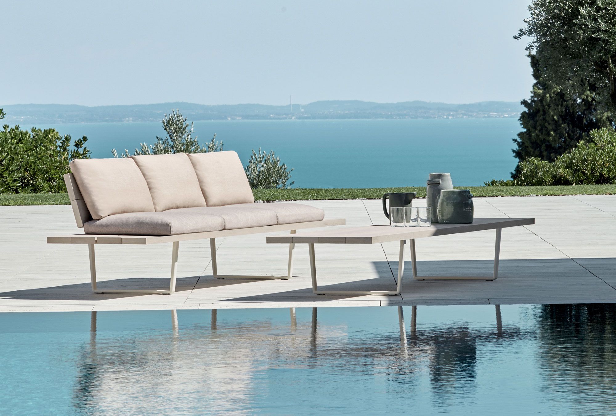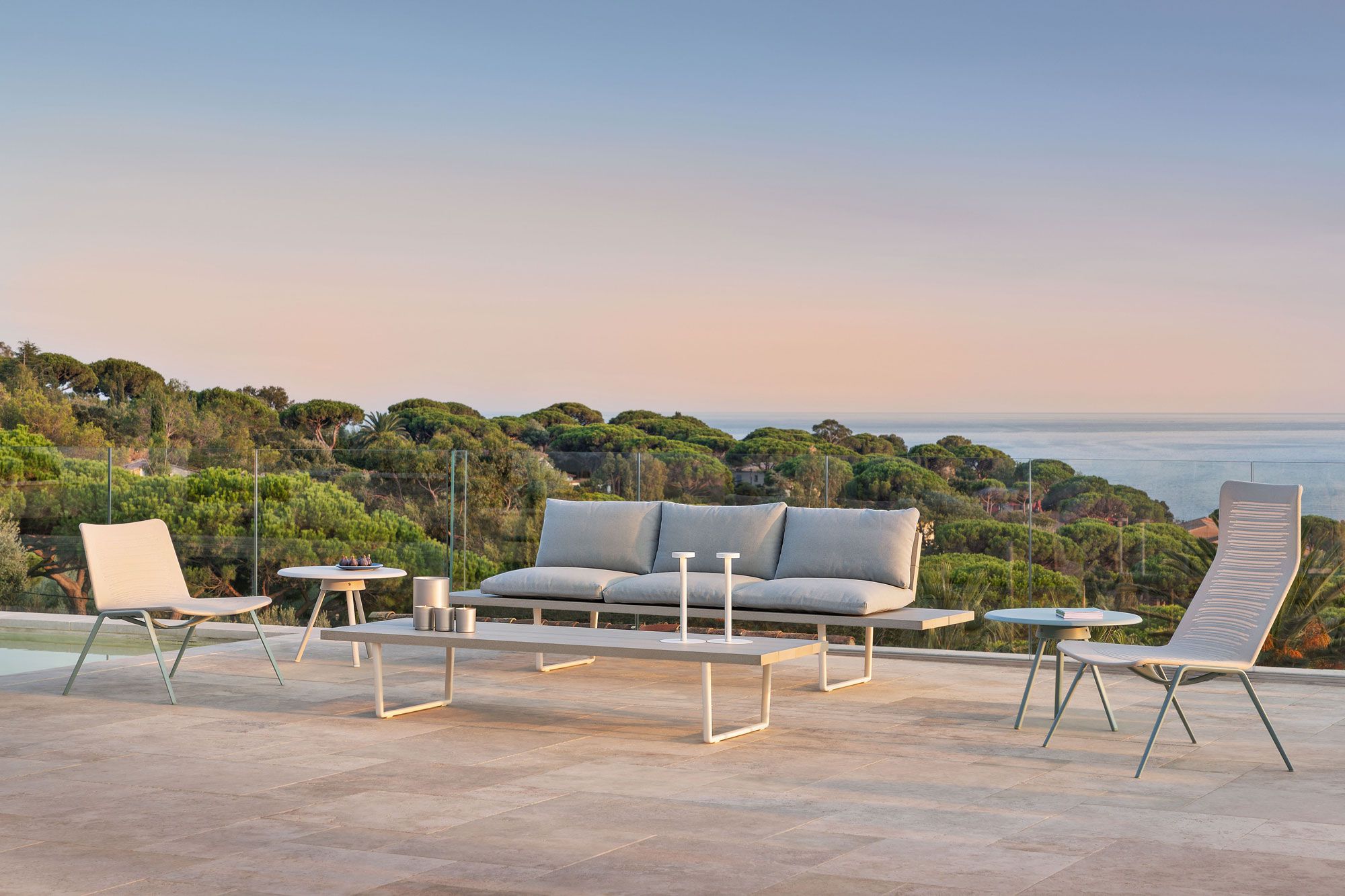 The Orizon collection includes: dining tables, low tables, benches, sofas and chaise-lounge.