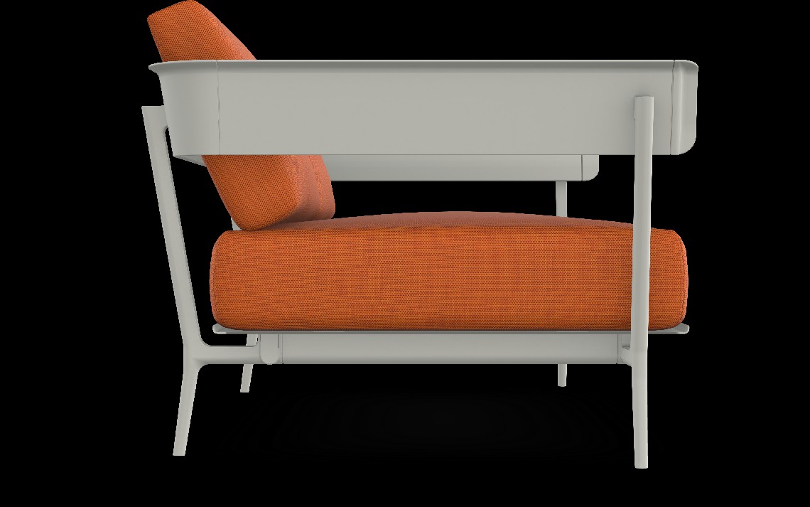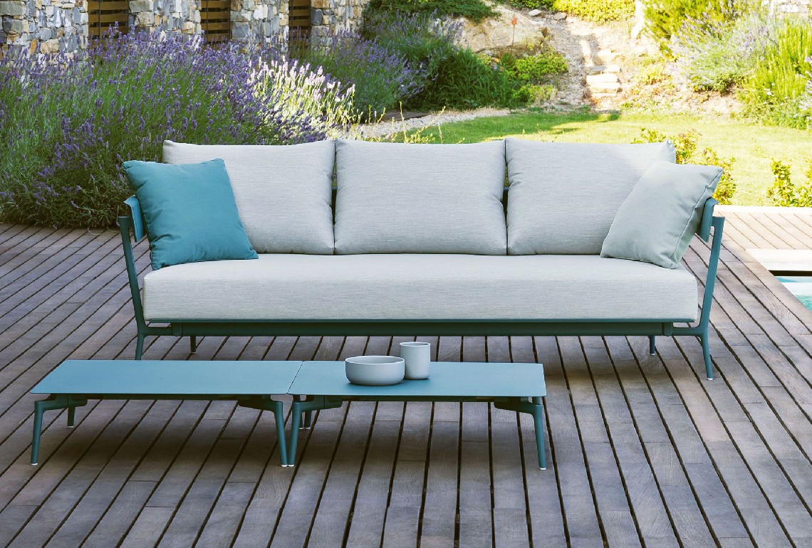 A genuine outdoor sitting room: Aikana is a system of individual and modular elements to be combined to your liking and create either roomy or cosy settings. The frame is made of die cast and extruded aluminium and the cushions are fully removable. Available also in the waterproof version, these cushions are resistant to rain, humidity and moisture, stains and dust: they do not need to be stored away indoors nor do they need to be covered.