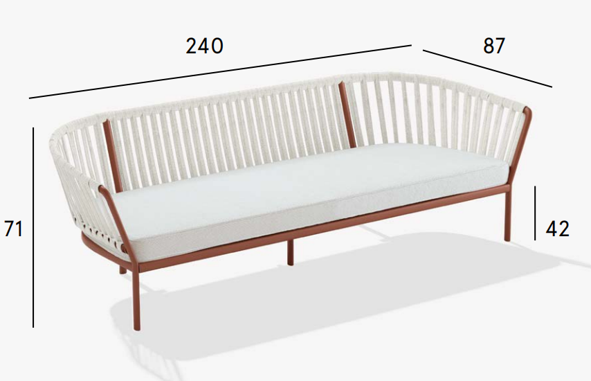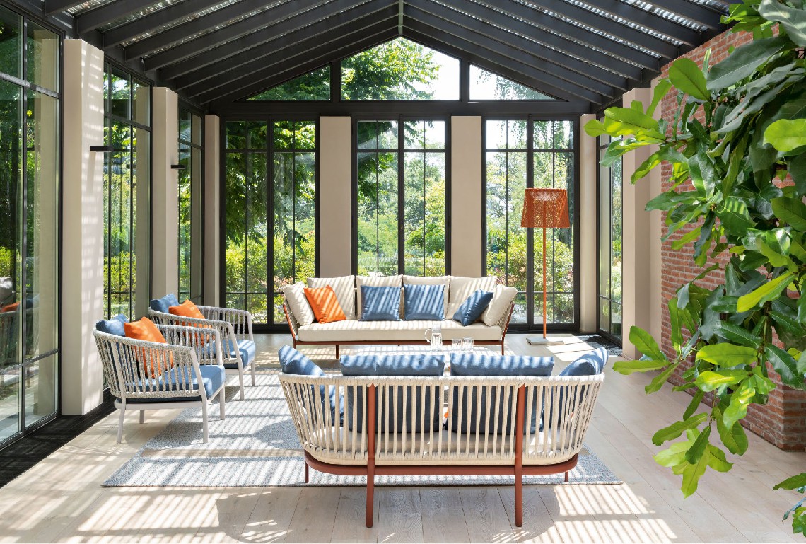 The Ria collection includes: dining armchair in the aluminium, partially woven rope, fully woven rope and with quilted backrest versions, 2/3-seater sofas, armchair, lounge chair and daybed in the woven rope versions.