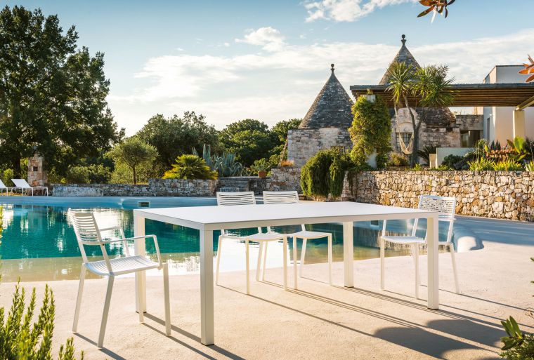 A clean-cut look in its myriad forms: this is the best way to sum up the Easy collection, in die cast and extruded aluminium. Sleek, slimline shapes, which match one another with ease, or with the garden tables and chairs from other collections. The chair and armchair are stackable. Cushions available upon request.
