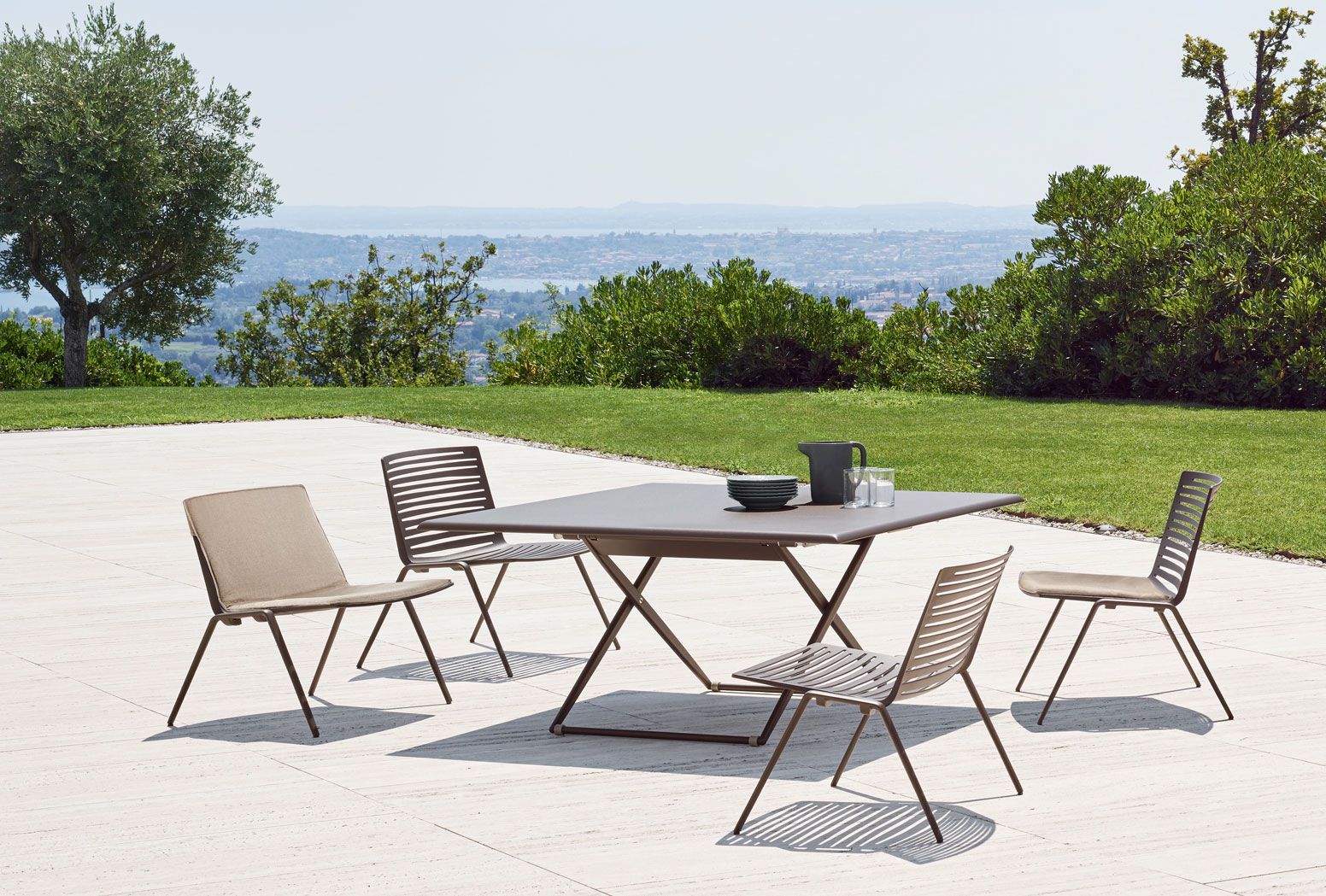 The encounter between the solidity of the material and the light weight of the shapes. In the Zebra collection, the die cast aluminium is structured by removal, which with a game of blocks and voids, illuminated by the sun, designs mesmerising geometric shapes on the ground. For even greater comfort, cushions are available for the seat and backrest, covered with fabrics which are suitable for outdoor use: resistant to water, to stains, to UV rays, and to abrasions.