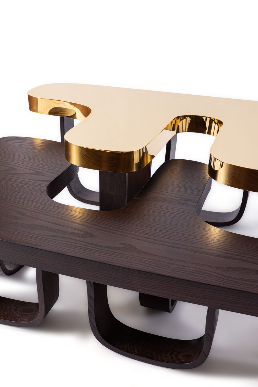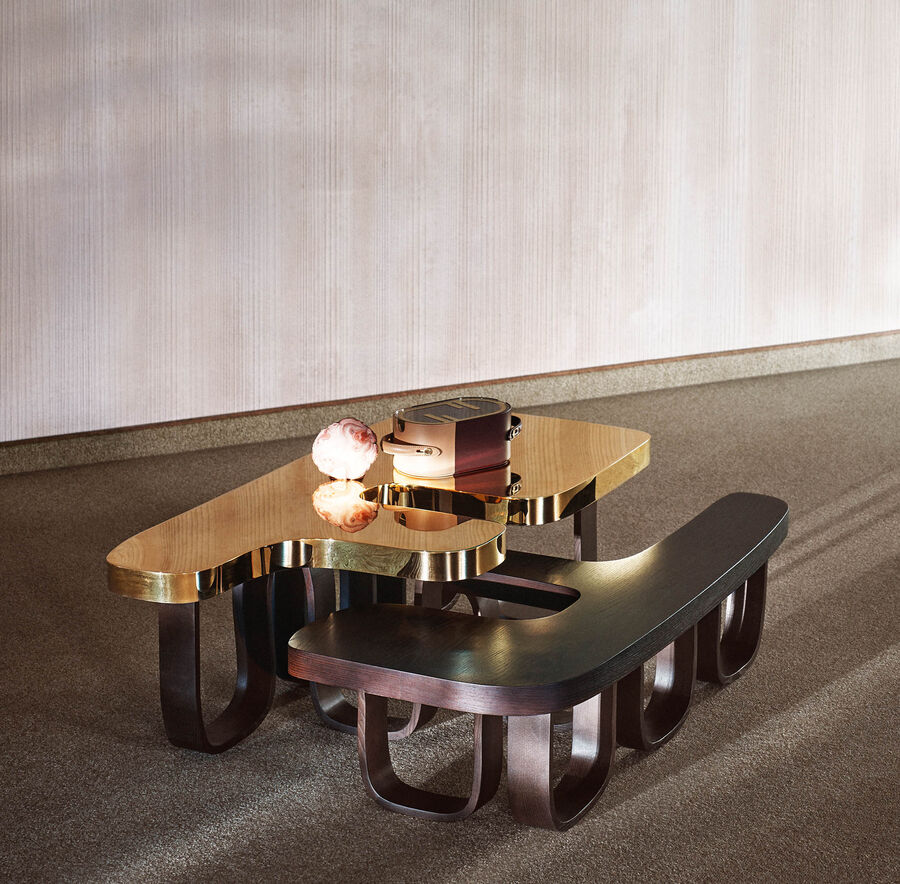 Pairing metal and Panga Panga wood, two very distinct materials, Mabeo Studio have created an eye-catching coffee table. The Efo table takes the iconic Fendi double F logo and transforms it into a unique piece that brings the worlds of design and craft together. Two modular sculptures nestle within each other, simultaneously retaining their independence.