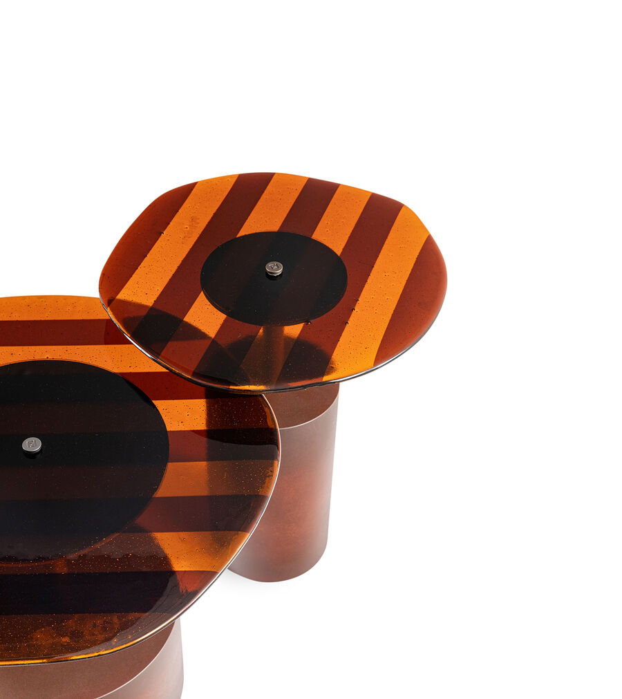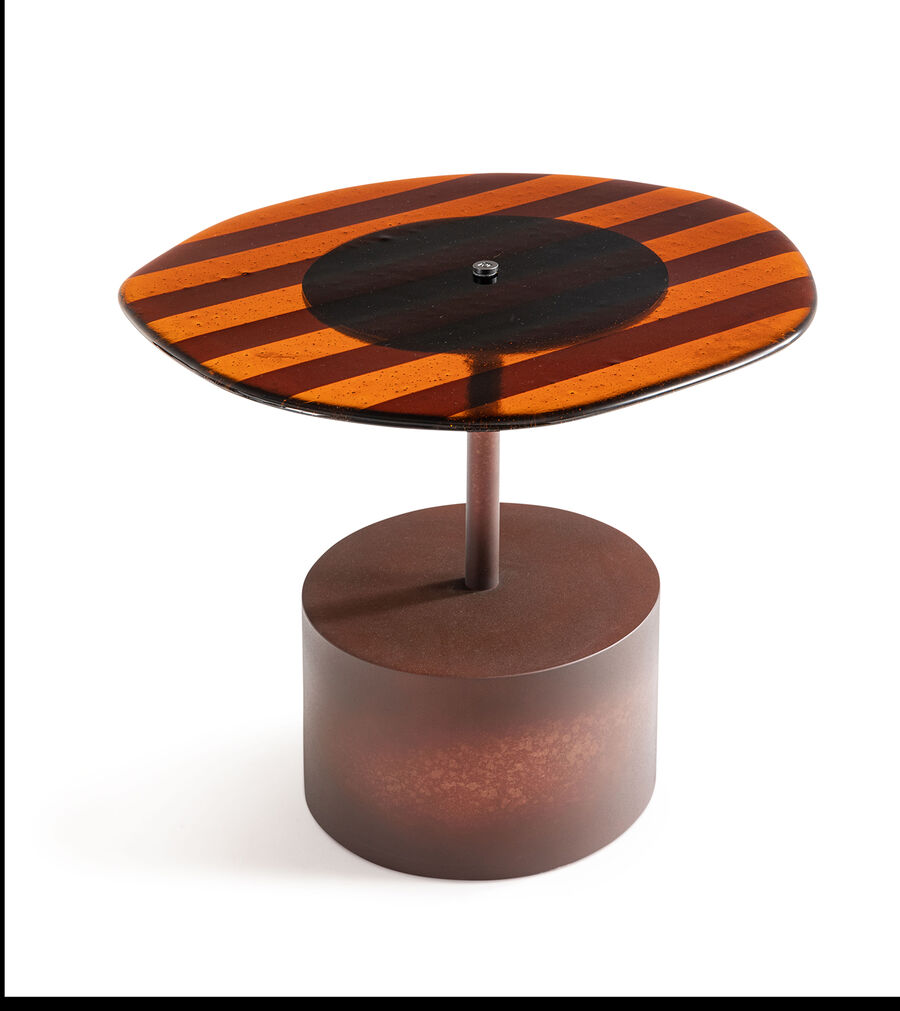 Innovative aesthetic and tactile effects define a design project that fully represents the stylistic codes of the Fendi Maison. The main structure, rendered in raw-finish gunmetal or corten, is inserted into a smooth, handcrafted Murano glass top with Pequin stripes, creating a bold materic contrast. Irregular edges nod to organic elements, while the tubular FF-patterned metal details alternate between solid and empty spaces.