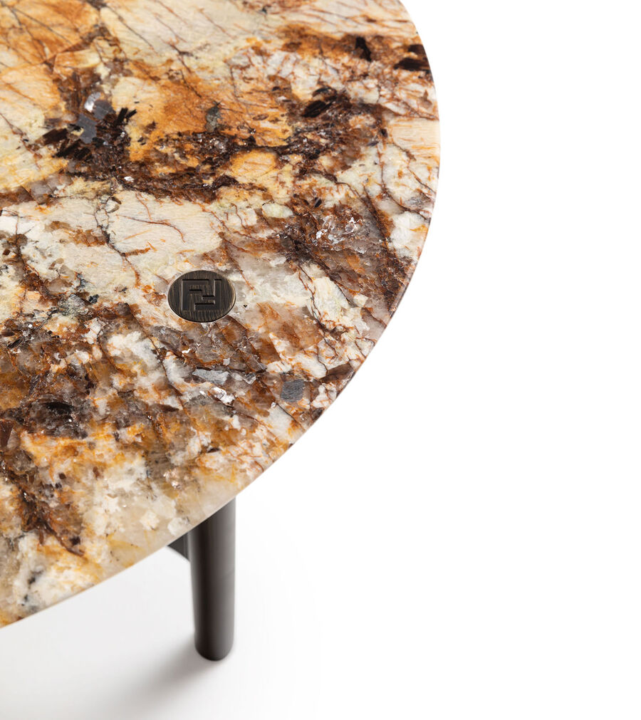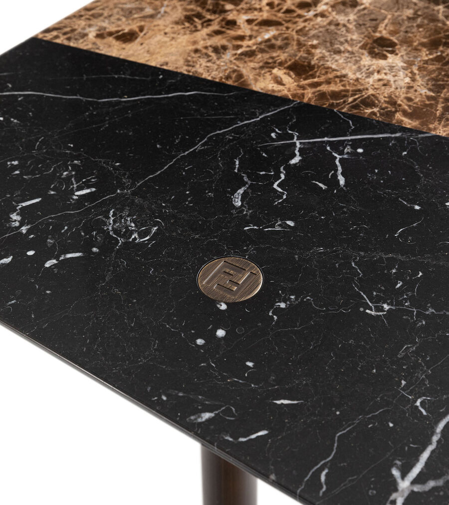 Designed by Toan Nguyen, this low table is part of the Totu project, incorporating all its distinctive characteristics. The geometric interlocking levels are enriched by a refined combination of marbles, arranged to recreate the archival Astuccio pattern. The tubular metal legs, enriched with FF detailing, link to the top of the piece to create a stylistic continuum that's typical of the design project.