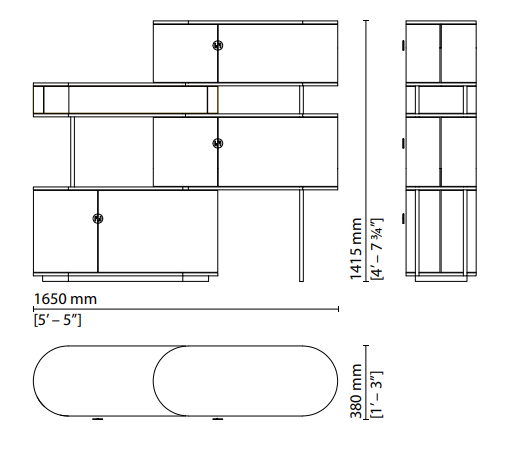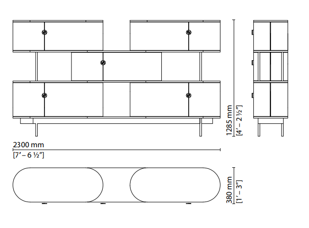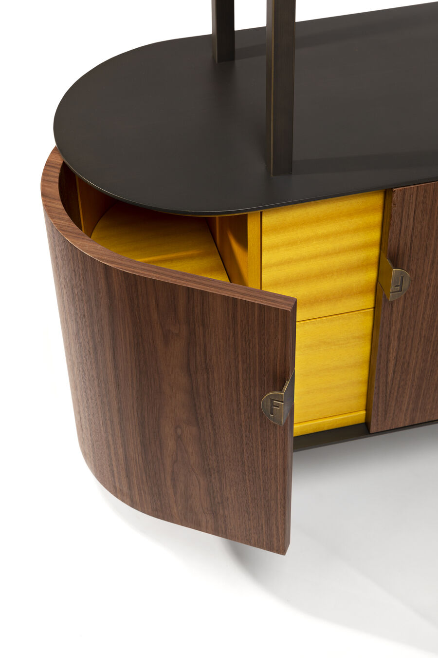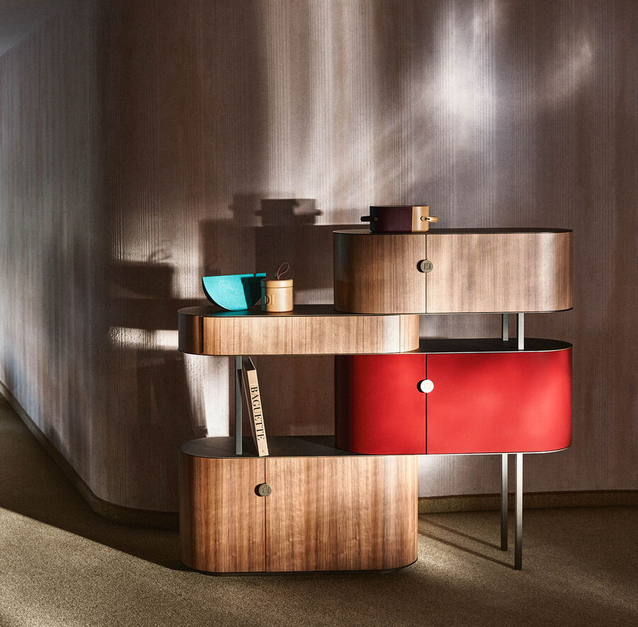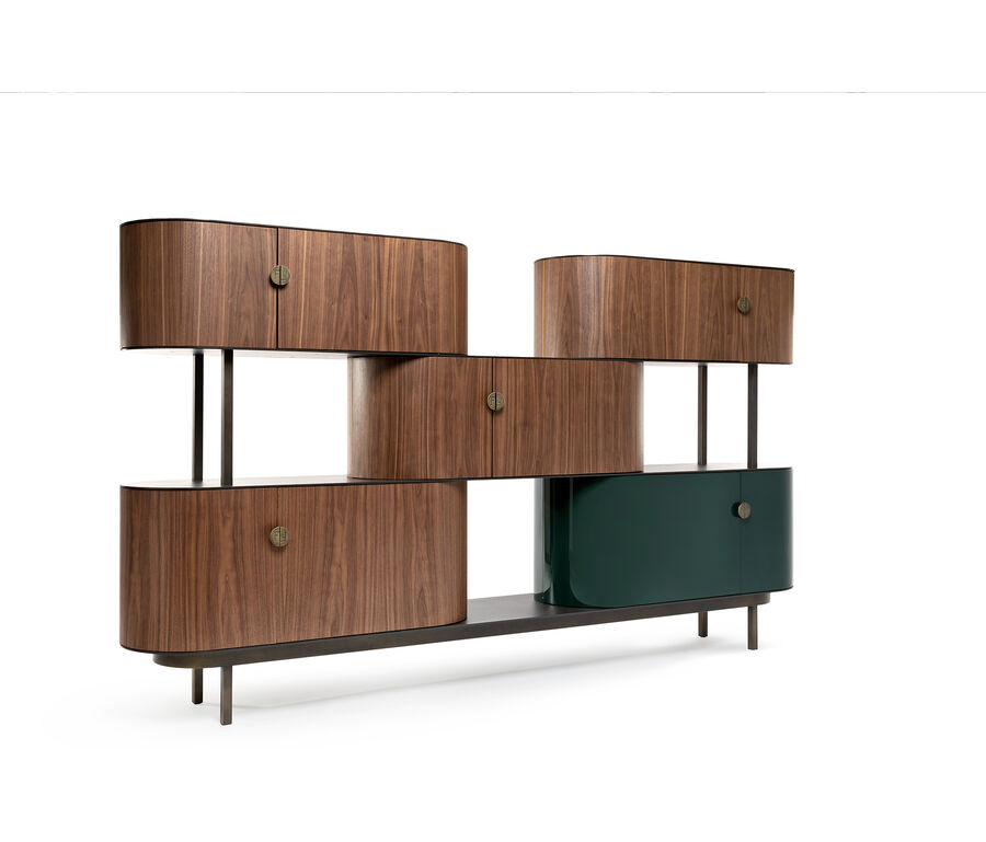 The Maglia sideboard combines wood and metal in a composition of shelves and asymmetrical two-door drawers. The curved wooden drawers are distributed on steel-sheet shelves in a modular harmony of solids and voids that can be assembled to respond to different needs in a home setting. Available in a choice of 4 and 5 modules, it can be customised with contrasting finishes and handles with the FF logo to accent each of the individual elements.