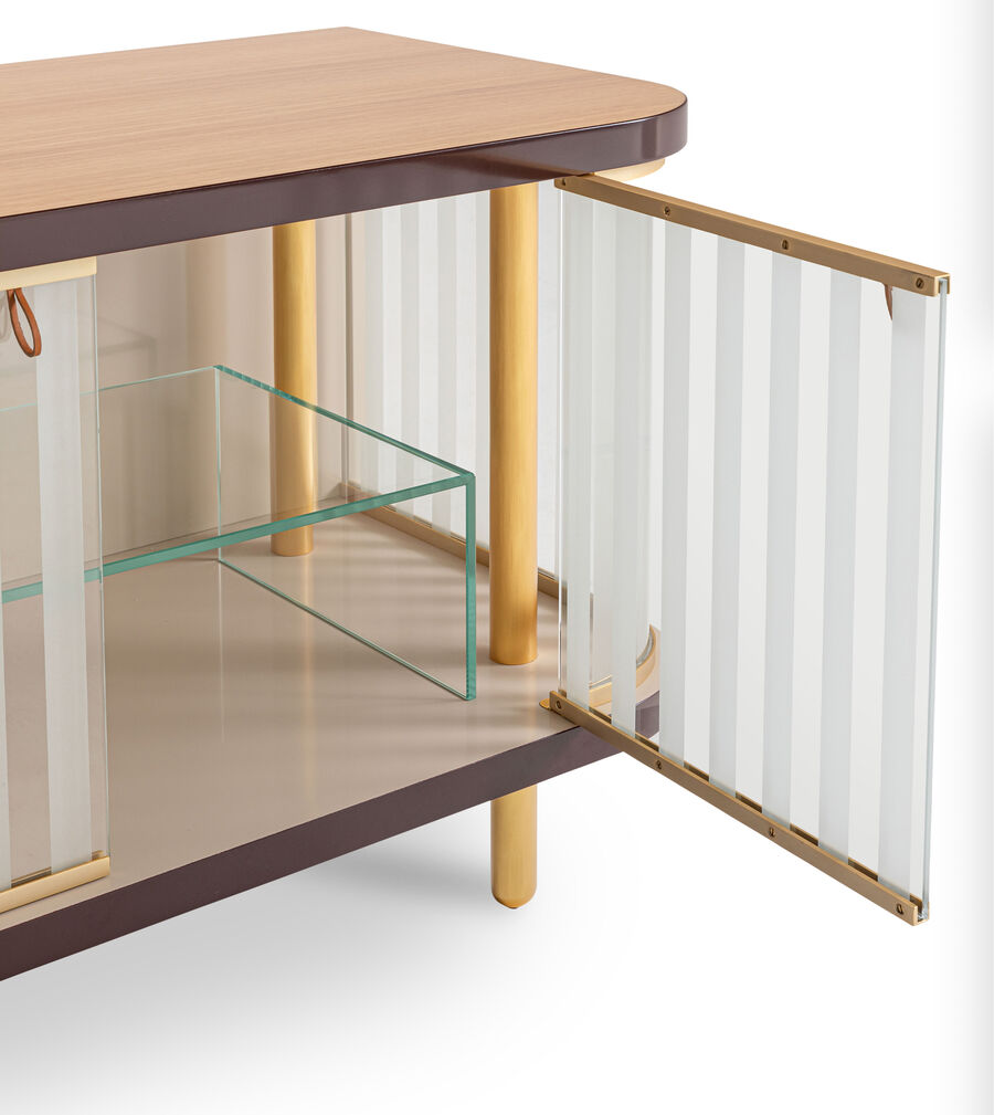 With its distinctive fluted panels in Pequin-effect sandblasted glass and lacquered wood details, the Vittoria sideboard is an original take on retro style. The top is available in a choice of natural oak, American walnut and sycamore frisé. The matt-finished metal elements and base combine with the internal wooden frame, transparent glass shelves and leather handles in a harmonious tactile contrast.
