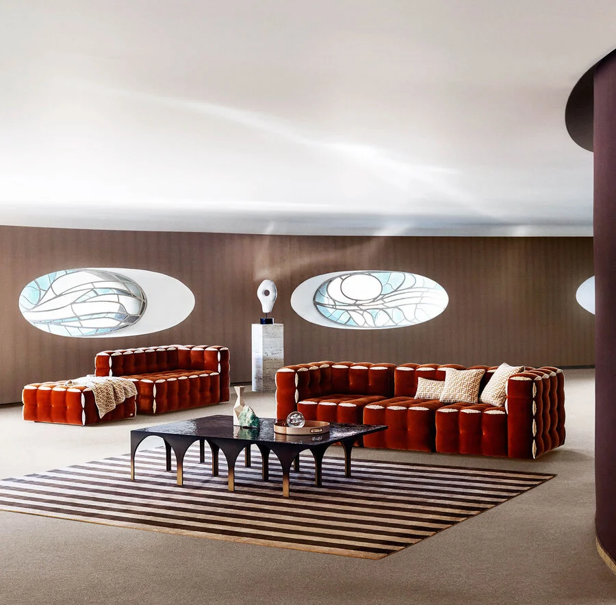 The renowned Fendi artisanal heritage is expressed to perfection in this playful series of ultra-comfortable padded armchairs and sofas inspired by the iconic Peekaboo bag. Designed by Atelier O?, each piece features fabric or leather upholstery with side slits offering glimpses of the padding for an original series of soft forms. The different pieces combine in a myriad of ways to create inviting compositions that can be arranged to suit the space and your mood.