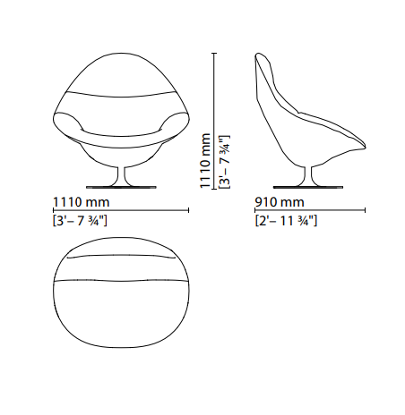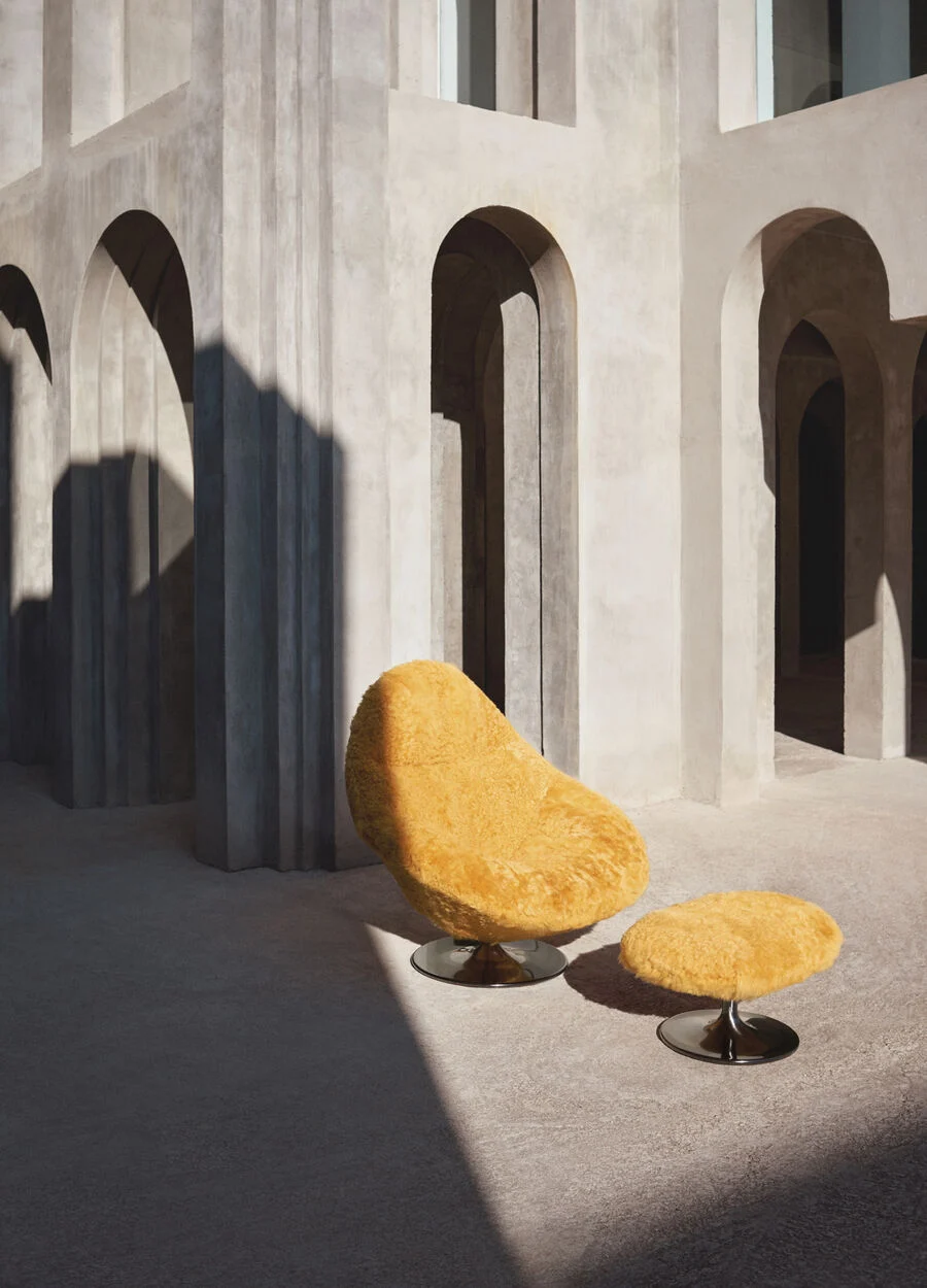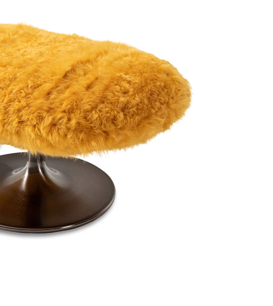 With its retro-futuristic design, the Groove & Groovy chair is designed with sheer relaxation in mind. Its inviting form creates a sense of elegant yet informal comfort, with its soft seat and matching ottoman only adding to its tempting presence. Both pieces feature a matt metal base in dual finish, with a swivel mechanism in the footrest. The yellow sheepskin upholstery injects a striking touch of stylish colour into any interior.