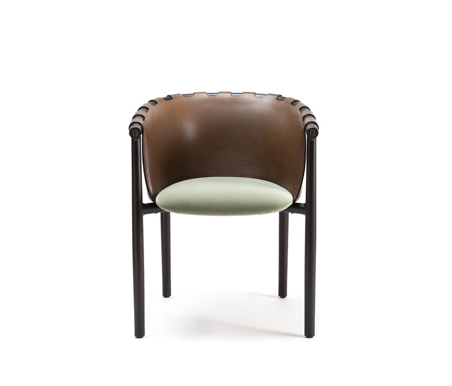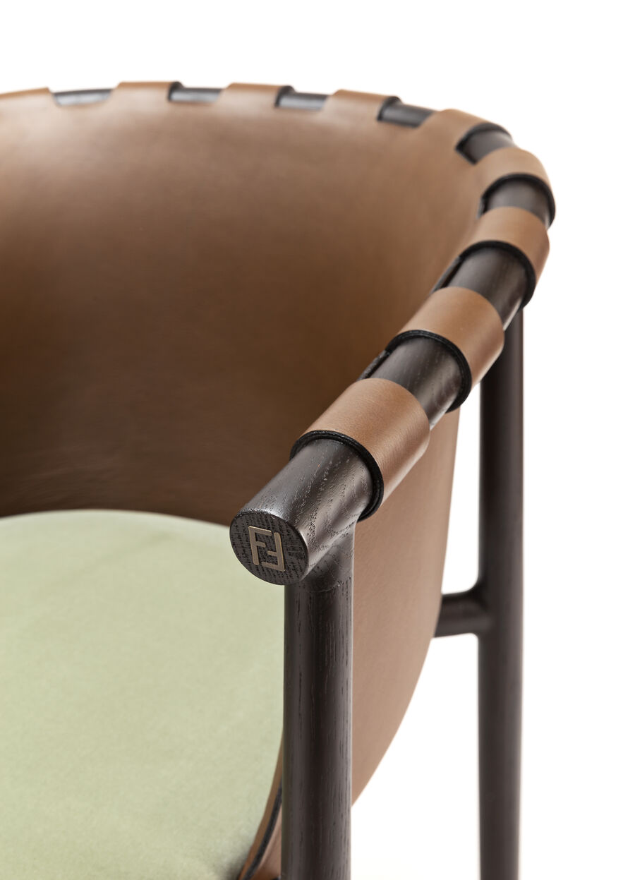 The Cleo chair and armchair seamlessly fuse the essence of contemporary design and the nostalgia of tradition. The pared-back design features a leather back that seems to embrace the wooden frame to recreate the effect of the iconic Pequin pattern. Ideal for both living and dining zones, it offers the allure of versatile seating and the pleasure of a sophisticated conversation.