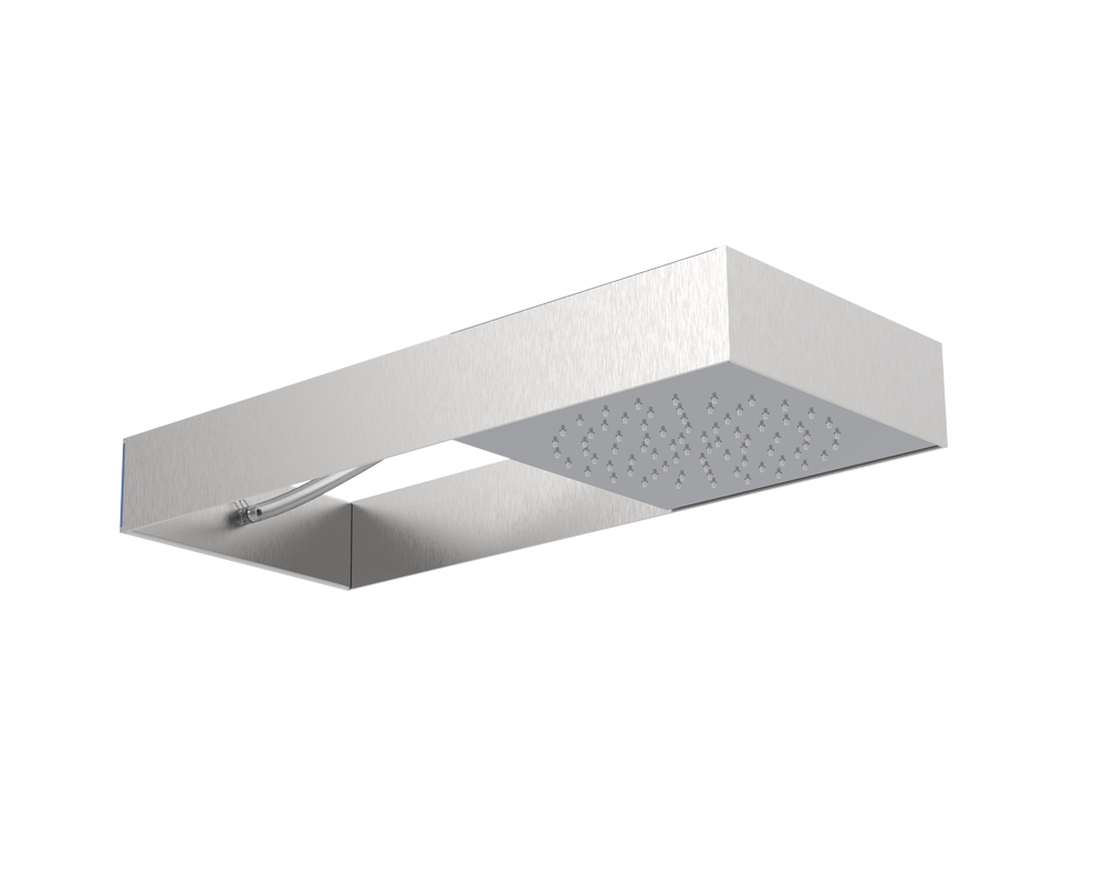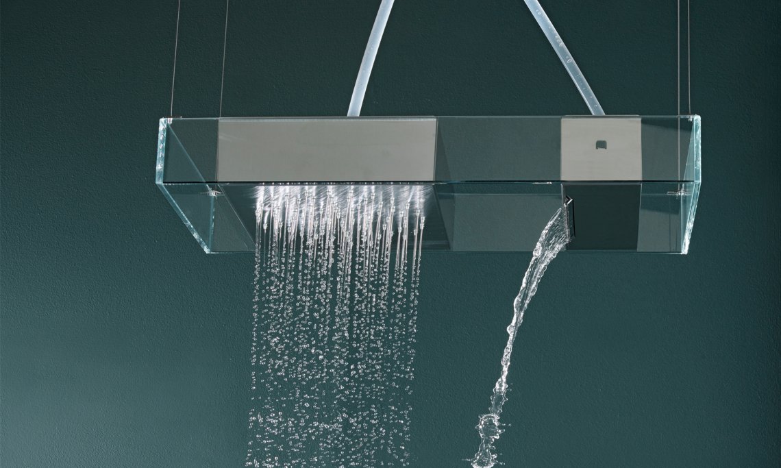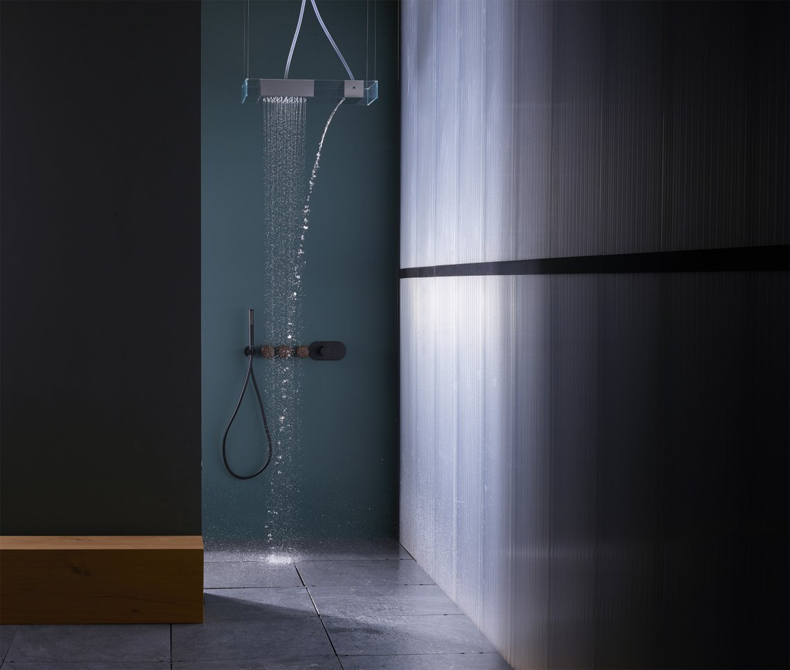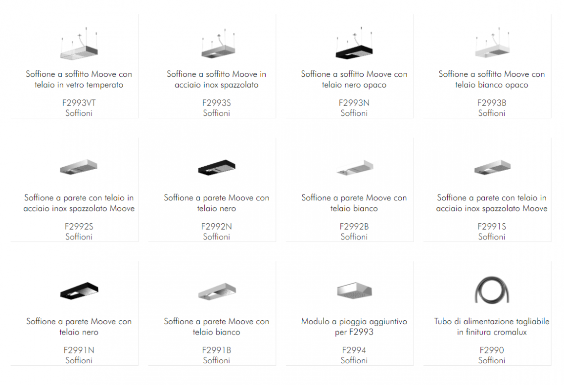 A livello formale Moove si caratterizza per un telaio rettangolare dalle linee minimal che ospita uno o più moduli in acciaio con due diverse funzioni - soffione rain tradizionale o lama d'acqua a cascata - che scorrendo al suo interno permettono di variare la posizione dell'uscita dell'acqua amplificandone la dimensione wellness.