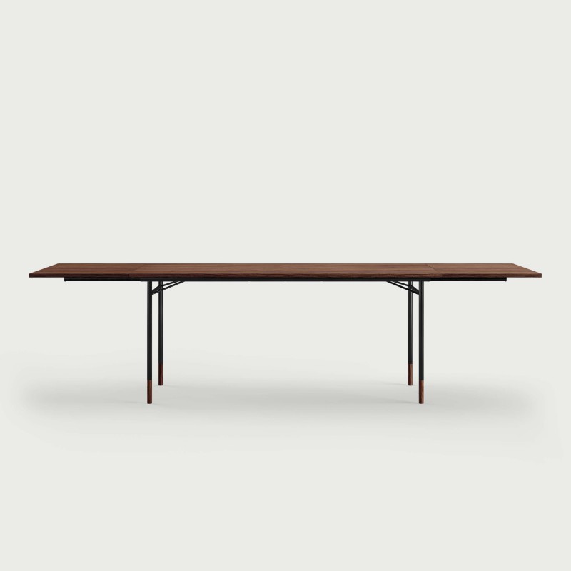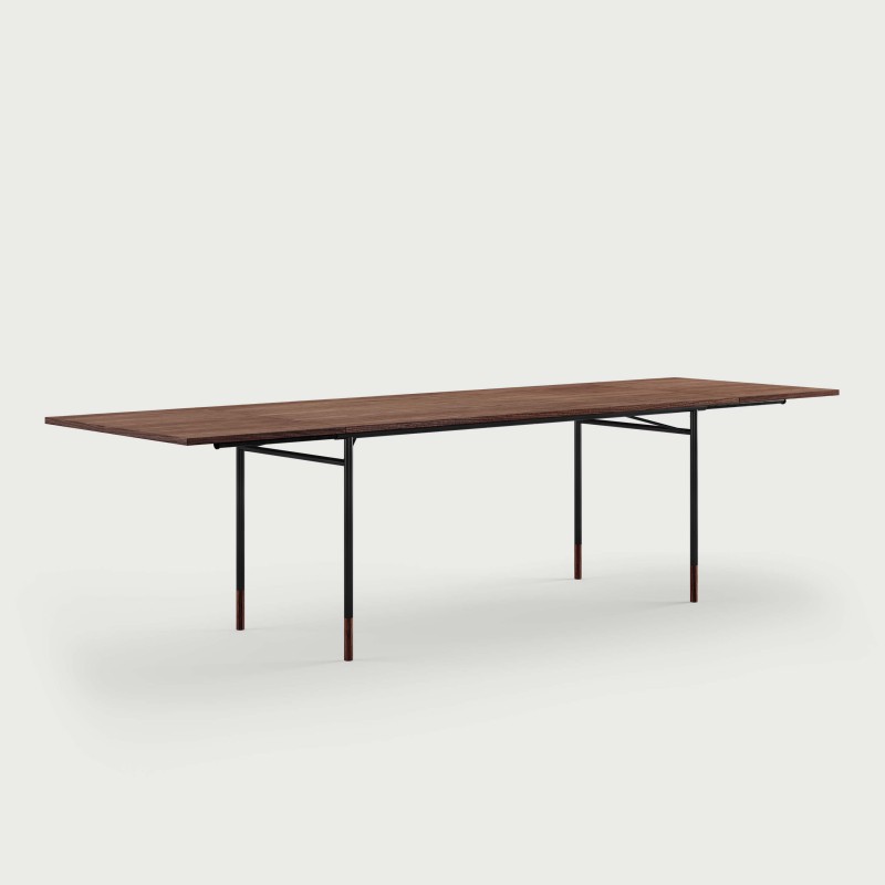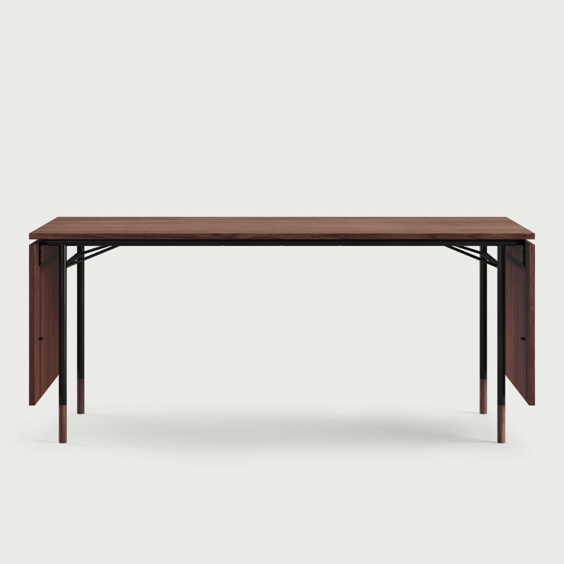 Materials: Teak, oak, walnut, Oregon pine veneer or linoleum in the colours 'black' or 'mushroom' with matching wooden toes. Tabletop in veneer or linoleum with solid edges. Painted frame in black, orange or light blue.
