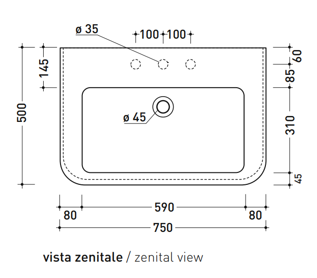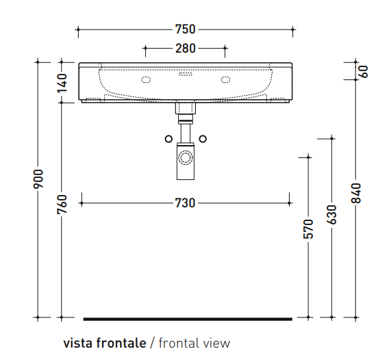 Basin 75 cm wall hung, countertop or suitable for pedestal