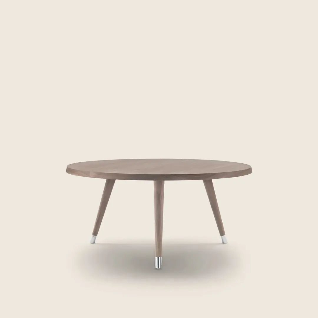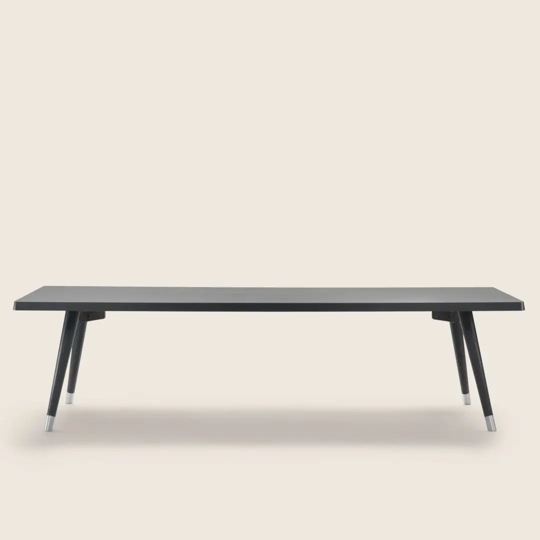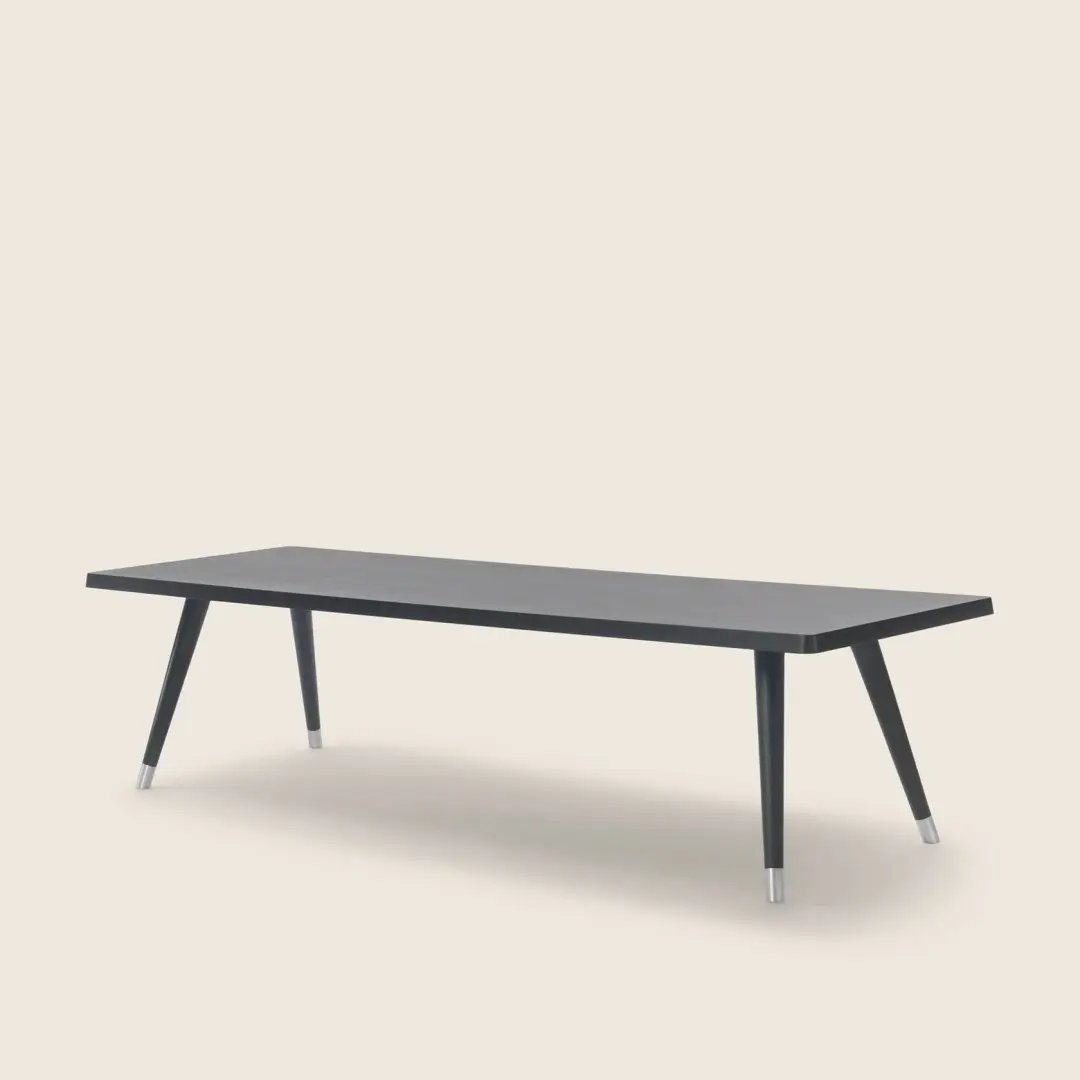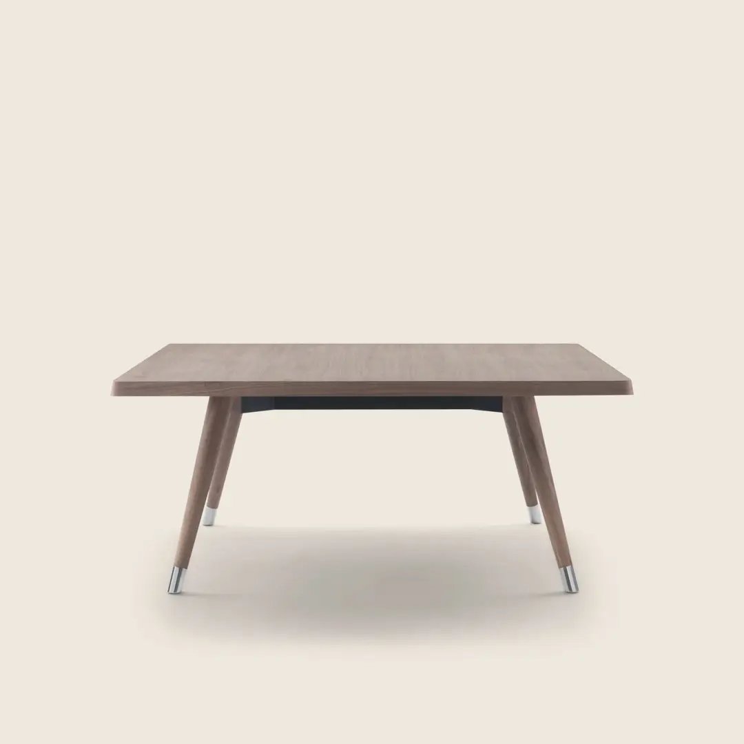 A minimalist-inspired support base composed of tapered legs in turned wood finished with elegant metal tips supports thick tabletops with rounded corners.