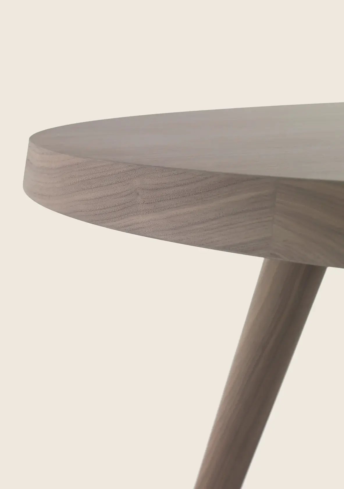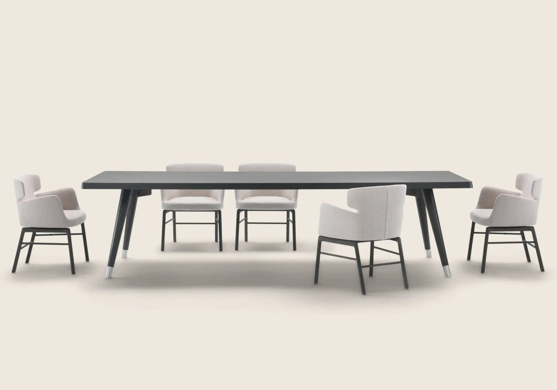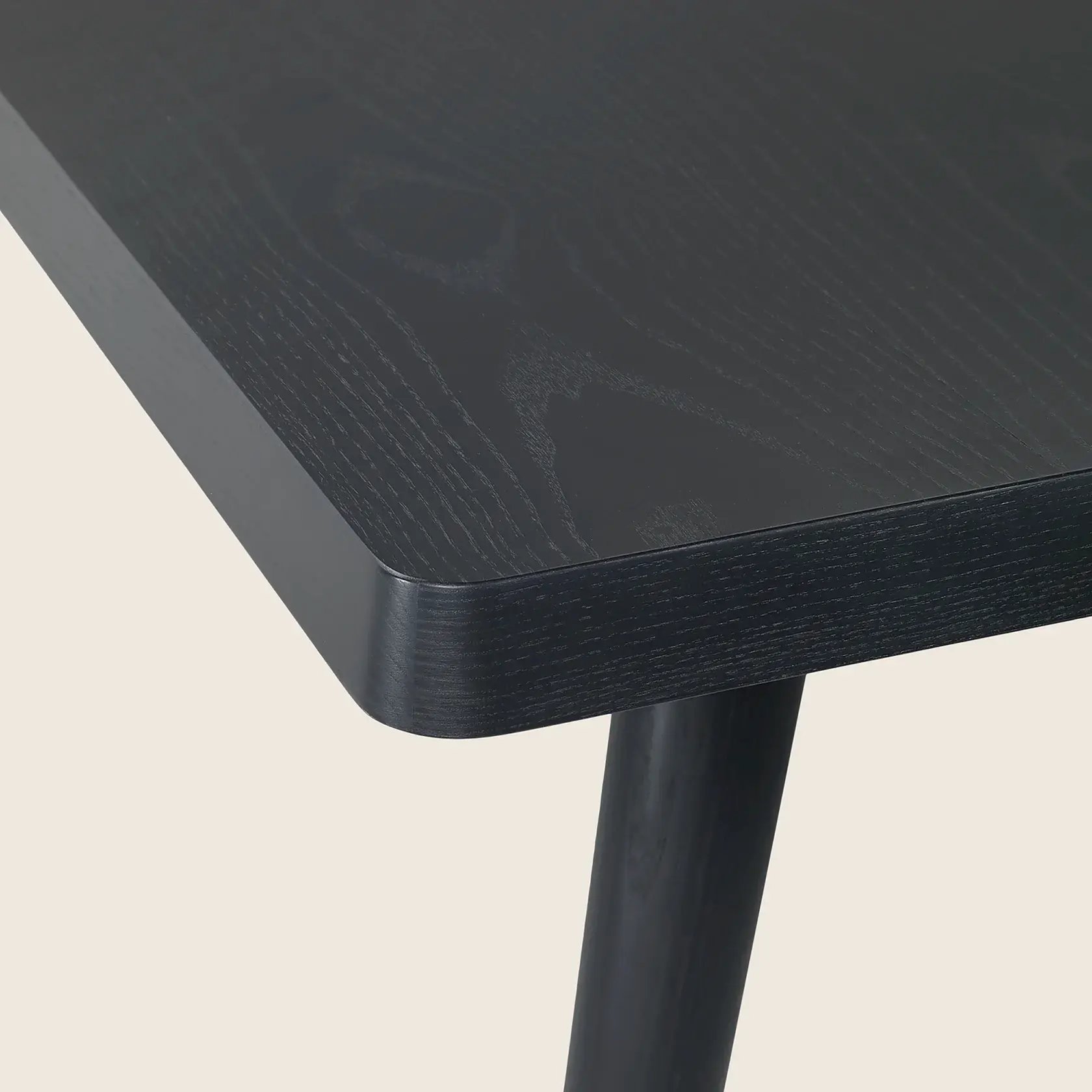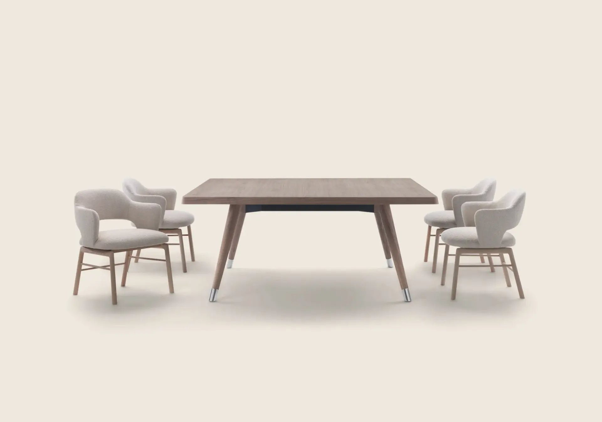 A minimalist-inspired support base composed of tapered legs in turned wood finished with elegant metal tips supports thick tabletops with rounded corners.