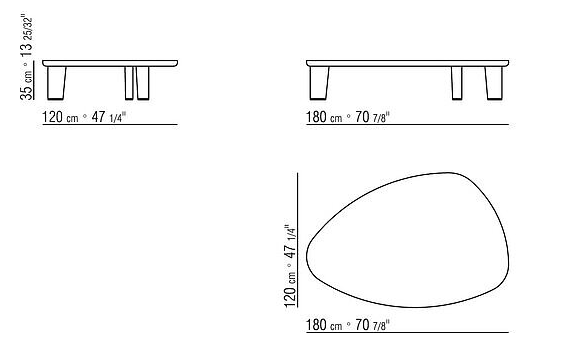 The design of the legs and their oblique placement lend an overall sense of dynamism. The density of the tabletop and of the legs adds solidity to the whole.
