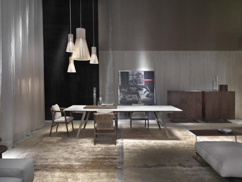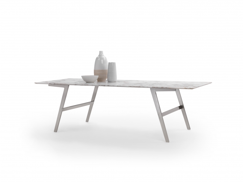 Soffio是一款結構嚴謹的桌子。 扁平的金屬支腿是這款桌子的設計特點。桌腿輕盈向上延伸,勾勒出獨特的“飛鏢”形,把桌子特別具有動感地托離地面。 Soffio桌子,既結實又空靈,輕盈的金屬底座與簡約的長方形桌面構成饒有趣味的對比。金屬底座表面處理有磨砂、鍍鉻、磨光、黑鉻與香檳色,桌面可選用多種顏色的卡納萊托胡桃木或歐洲白蠟木,或名貴的大理石。