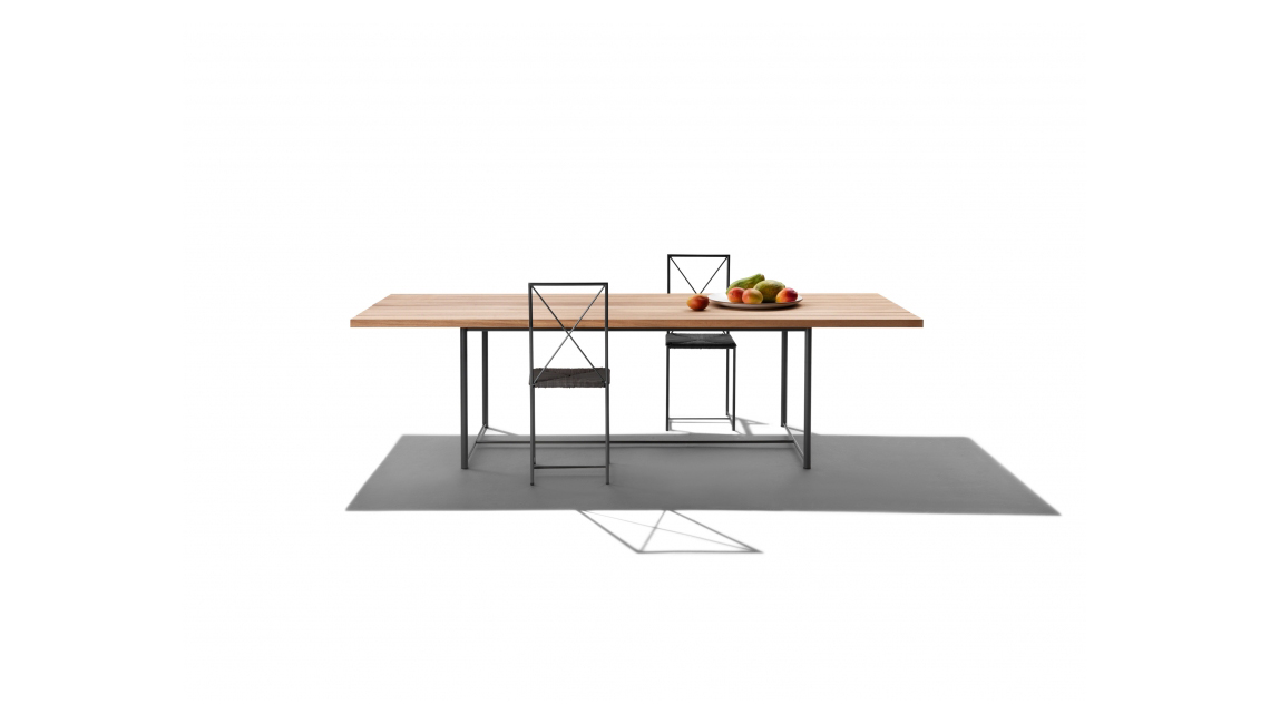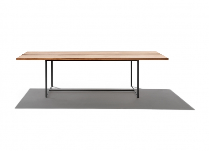 這款午餐桌的特點是追求簡約的設計,以及有趣的材質對比:316奧氏體不銹鋼底座的肅穆,搭配大綠柄桑木芯材板條桌面的溫暖質感,桌面顏色有天然、白漆或灰色。 鋼材底座也提供環氧粉末噴漆的表面處理,可選白色、卡其綠、酒紅色和磨光。