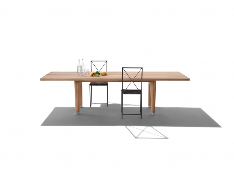 Monreale桌子問世兩年之后,Flexform如今推出它的戶外版本,完全采用大綠柄桑木制造,溫暖的質感結合出色的抵御天氣因素能力,為Monreale Outdoor桌子賦予了強大的個性。 Monreale Outdoor桌子的每一個結構細節,都顯示出簡單外表之下的復雜構成:粗大而簡約的桌腿采用大綠柄桑木芯材,突出了這款桌子特有的高貴與低調氣質。壓鑄合金支腳插在桌腿末端的銑削部件和尼龍橡膠內,可保護木材,避免與地面直接接觸。 桌面采用大綠柄桑木芯材板條,提供天然版本或灰色和白漆版本。