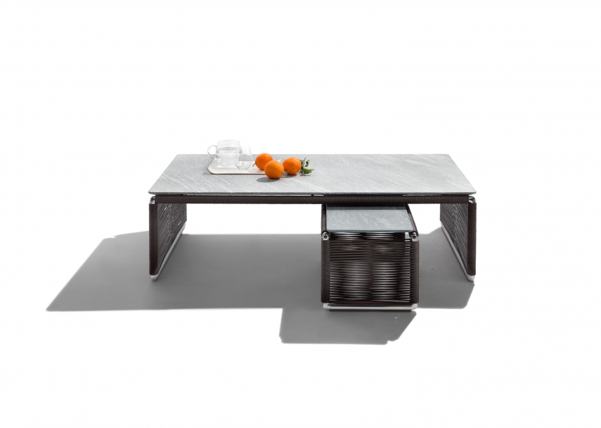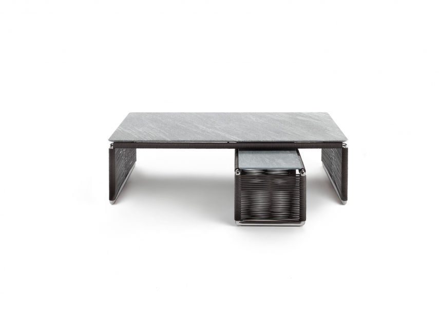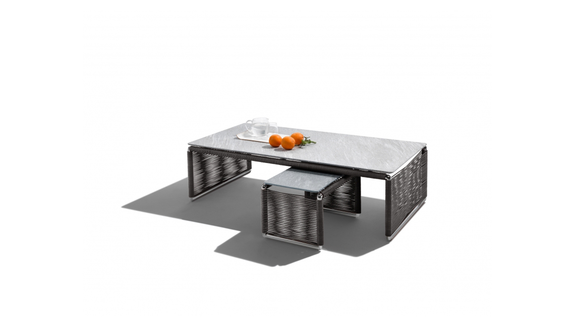 Tindari Outdoor茶幾完美詮釋了Flexform的一個珍貴主題,即編織。 茶幾的結構采用擠壓鋁材,表面涂層為環氧粉末噴漆。整個結構都包裹在輕盈結實的聚丙烯纖維或聚氨酯橡膠編織里,色彩包括天然色調、波爾多色和橄欖綠色。 巧手工匠的手工編織,為冷峻的金屬帶來溫度,帶來了一件個性鮮明的家具,可輕松搭配Flexform戶外系列的所有座椅,為露臺和陽光房的布置增添優雅格調。 Tindari茶幾也有石材臺面的版本,可選銀色Beola石,火山石,斑巖或卡多灰沙石。