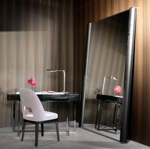 Egon鏡子具有引人注目的場景效果,可為家居不同環(huán)境添加顯著的裝飾亮點,從玄關(guān)、臥室乃至客廳皆宜。 長方形的鏡子帶有烏木色白蠟木板支架。鏡子兩側(cè)鑲有半圓柱形的簡約框架,上下則裝飾著優(yōu)雅的金屬細節(jié),有多種表面處理工藝可選。