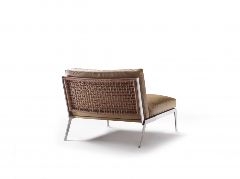 Happy扶手椅具有同名沙發同樣的莊重優雅。獨特的靠背由金屬框架加上考究的寬條紋編織構成,編織完全以皮革繩索手工制作。 金屬結構嚴肅優雅,與柔軟的鵝絨填充坐墊靠墊形成對比。 覆蓋面料邊緣帶有一道羅緞鑲邊,可采用同色或撞色對比。