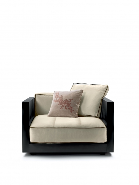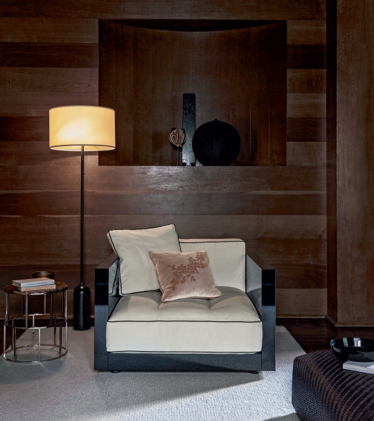 Lucien座椅系列如今加入了同名的扶手椅。 正如沙發一樣,Lucien扶手椅的靈感也是來自現代主義的建筑,扶手與靠背外部的光亮漆面突出了其嚴謹線條與方正造型。 椅墊和靠墊的鑲邊采用對比色,添加個性,突出了扶手椅的幾何設計。