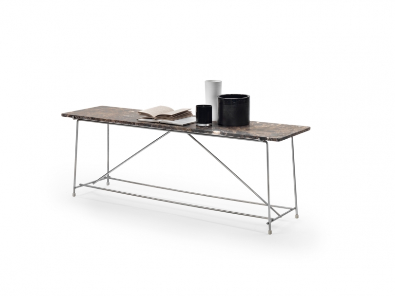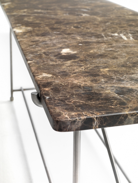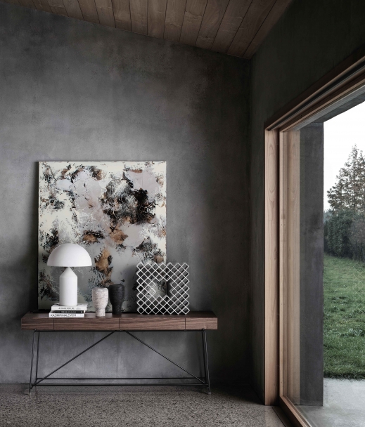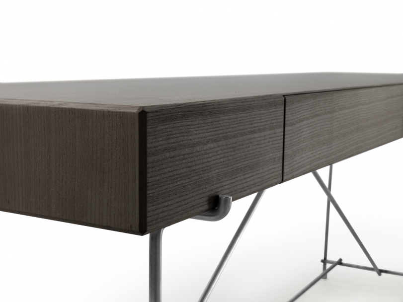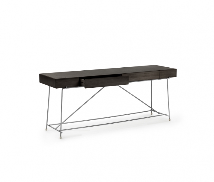 光滑的金屬結(jié)構(gòu)支撐Canaletto胡桃木貼面元素,并配有實(shí)用的抽屜,并采用一系列飾面。頂部可以用木頭或各種類型的大理石制成。