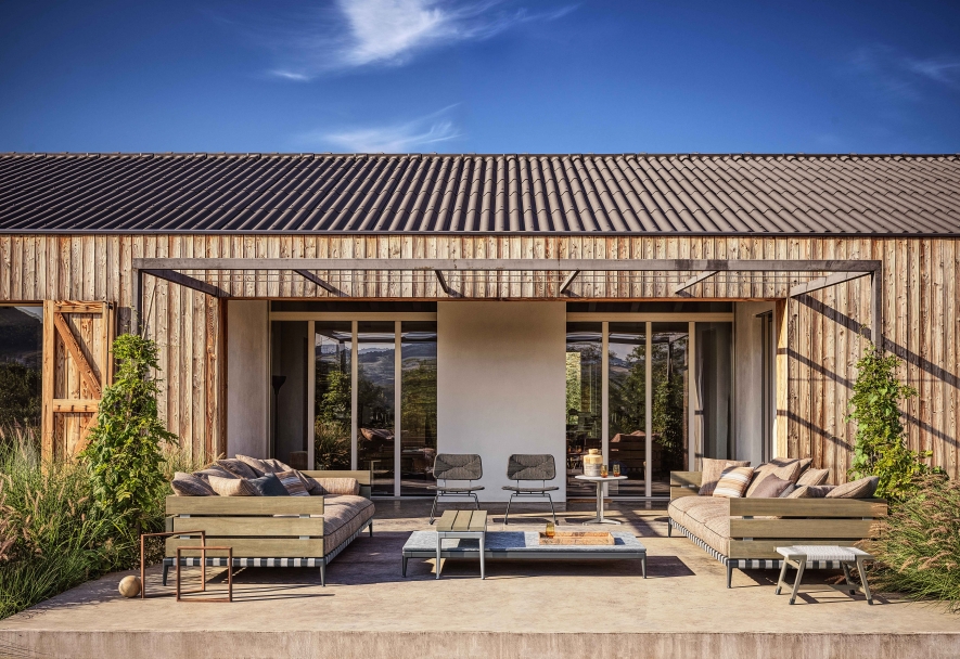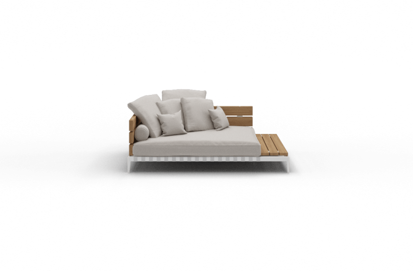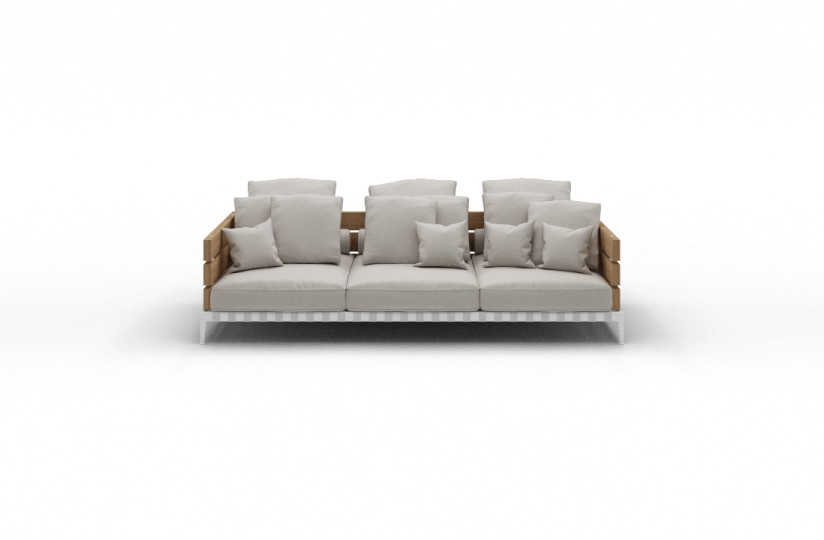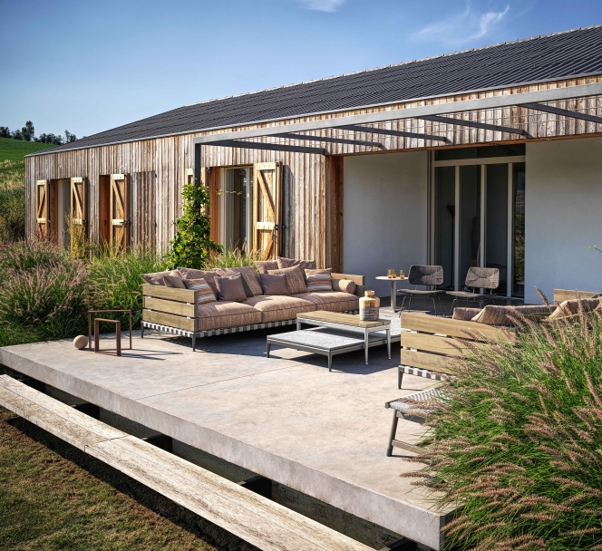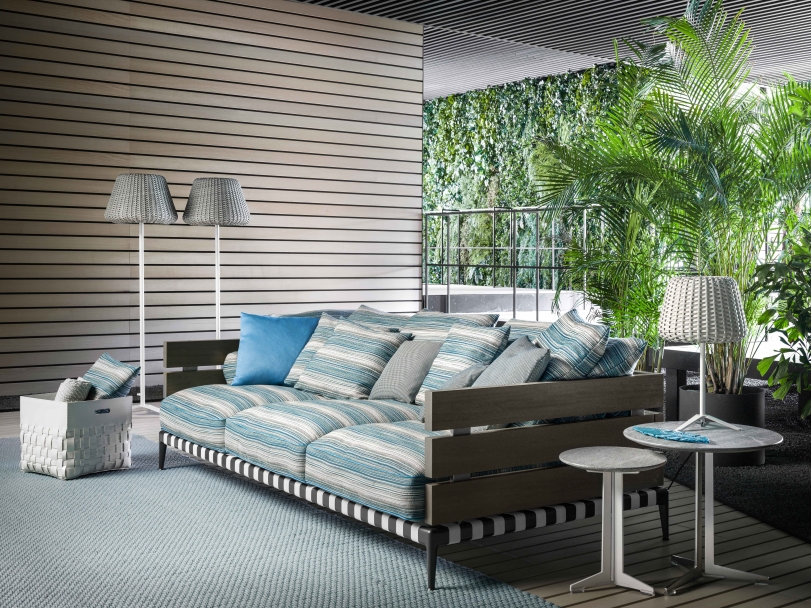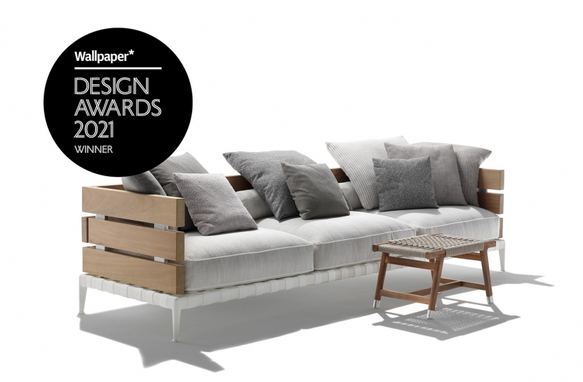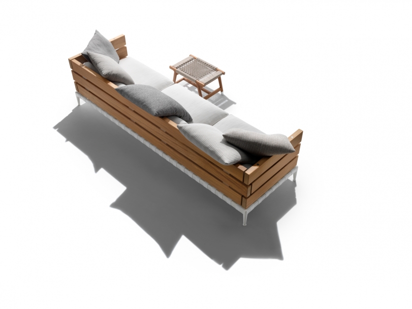 Ansel沙發的特點是出乎意料的材料組合:由iroko木板制成的扶手和靠背結構安裝在時尚的不銹鋼底座中。