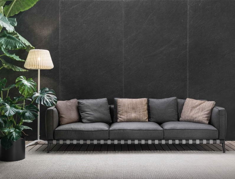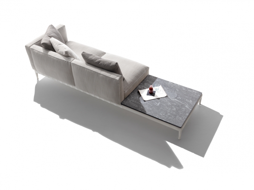 不銹鋼底座采用防水彈性織帶進行裝飾,而沙發的鑄鋁支腳則展現出精致,和諧的氛圍。