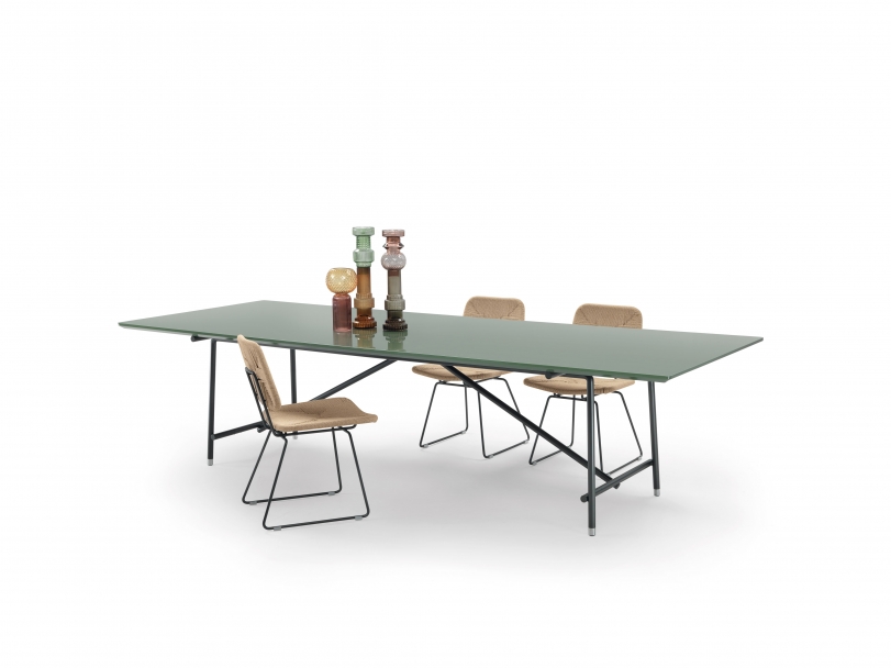 The metal structure of the Any Day dining table has uncluttered lines and is available in many finishes, while the tops come in Canaletto walnut or ash veneer; with glossy lacquer finish in a palette of sophisticated shades; or in various types of luxurious marble.