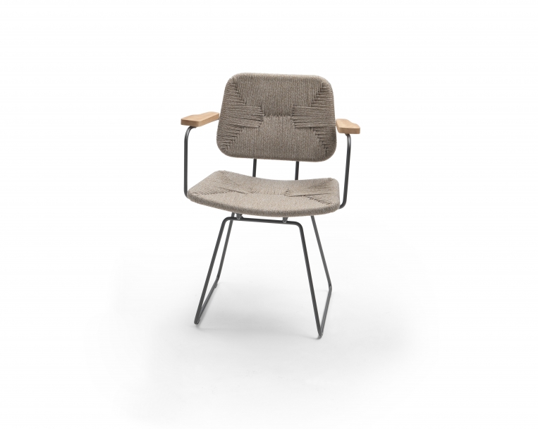 The construction of the Echoes Outdoor chair and armchair displays a bold material contrast: the structure is in sleek stainless steel while the seat and backrest are made of fine woven matt polypropylene cord in natural, ice, straw or anthracite color.