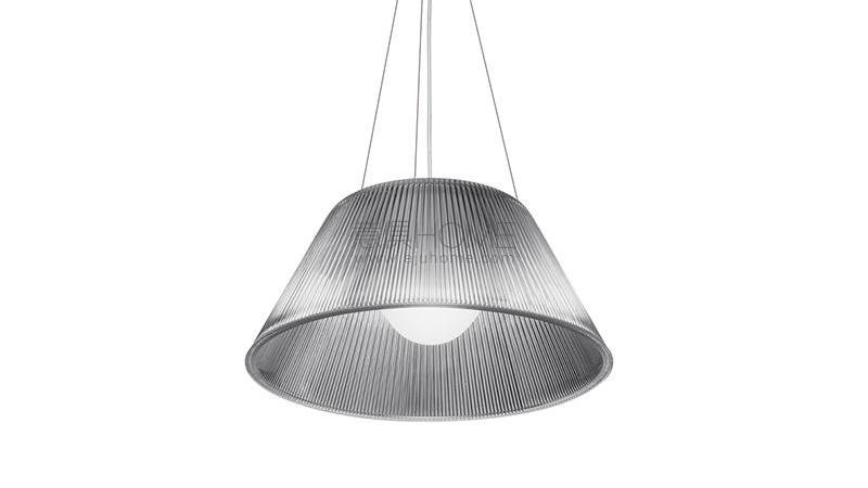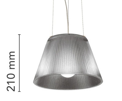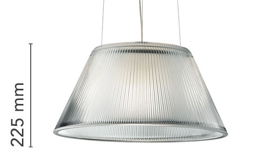 Suspension lamp providing diffused light. Acid-etched pressed borosilicate glass internal diffuser. Pressed clear glass shade. Injection-molded transparent polycarbonate diffuser support. Transparent, stamped polycarbonate dust protection screen. White, injection-molded ABS rose, galvanized pressed steel ceiling fitting. Free steel suspension cable.