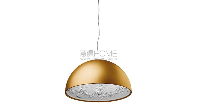 Suspension luminaire providing diffused lighting. Hemispherical, mechanically-processed cast plaster diffuser, painted white inside. Outer finish: rust, glossy black, glossy white or matte gold. Plaster diffuser support in die-cast aluminum alloy. Upper cable gland and blocking ring nut in black injection-molded PC. Shaped, adjustment screws. Transparent, injection-molded, upper and lower silicone shock absorbers. Lampholder and fixing support in PPS. Flashed and blown opal glass diffuser. Molded fixing ring nut in die-cast aluminum alloy with alodine plating. Frieze in photo-etched and mechanically drawn AISI 304 steel. Molded and galvanized steel ceiling attachment. Gray, injection-molded PC rose, painted the same color as the body.
