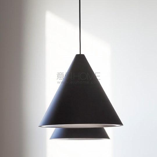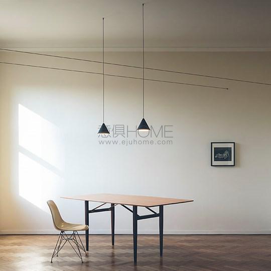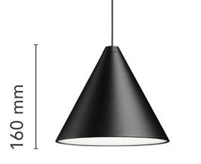 Suspension lamp providing diffused light. Matt black varnished die-cast aluminium body coated with clear soft-touch varnish. Optical diffuser in opal PC. Suspension system of 12 metres with Kevlar reinforced coaxial cable. Available with wall/ceiling connection in black PC and power supply with floor switch in matt black varnished PC. The on/off switch is electronic with optical mechanism. on/off and dimmer operated by means of available for Android and Apple remote control application.