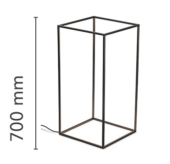 Floor lamp providing diffused light. Extruded aluminium frame 10x10x1 gratiné and anodized in various finishes. Led on the top edges incorporated in the extrusions and protected by transparent PC diffusers. Driver on plug, dimmable switch on chord.