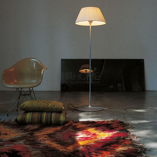 Floor lamp providing diffused light. Acid-etched pressed borosilicate glass internal diffuser. Plissé cloth shade. Gray painted steel stem and die-cast aluminum base and yoke. Injection-molded transparent polycarbonate diffuser support. On the cable there is the electronic dimmer which allows the regulation of light brightness.