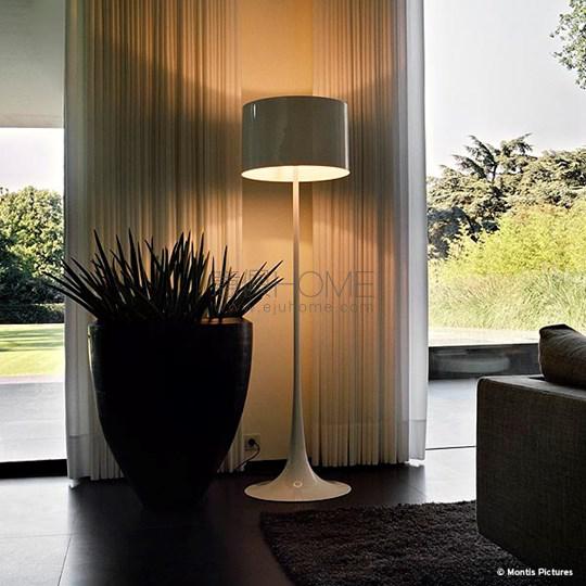 Floor fixture providing diffused lighting. Spun metal frame and diffuser, die-cast aluminum diffuser support arms and lamp-holder support, painted in the colors indicated below. White, injection-molded polycarbonate diffuser supports. On the cable there is the electronic dimmer which allows the regulation of light brightness.