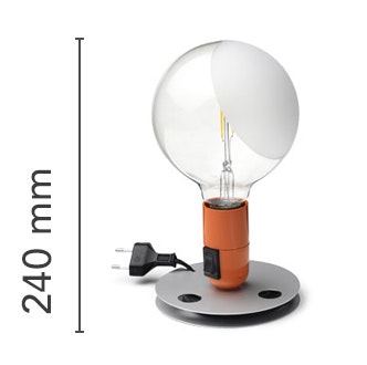 Table lamp providing direct, diffused light. Anodized aluminum base serves to contain excess power cord. Bakelite lamp-holder, painted to match the switch in the orange and black colors. Clear globe lamp is partially sandblasted to diffuse the light.