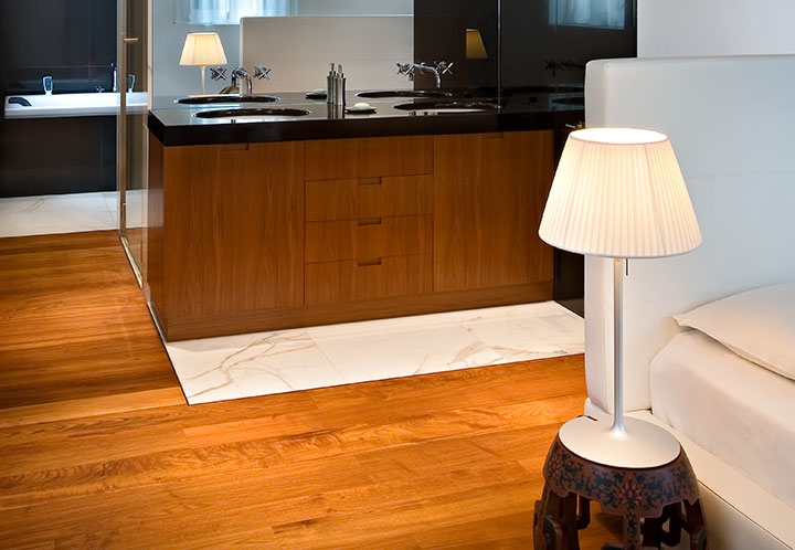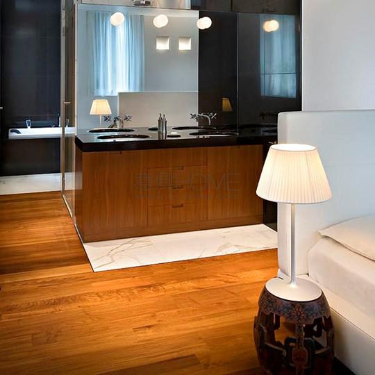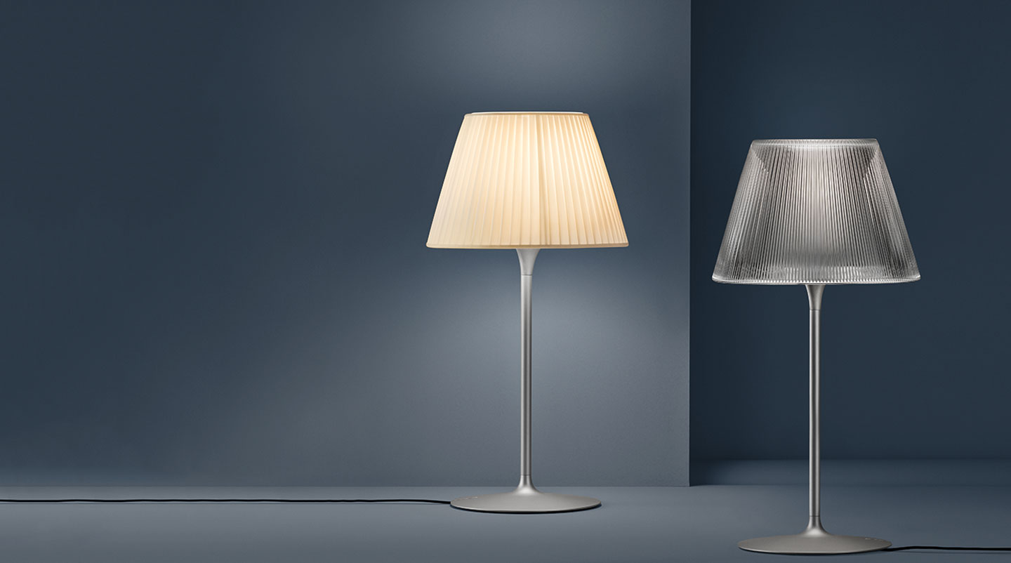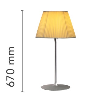 Table/desk lamp providing diffused light. Acid-etched pressed borosilicate glass internal diffuser. Plissé cloth shade. Gray painted steel stem and die-cast aluminum base and yoke. Injection-molded transparent polycarbonate diffuser support. On the cable there is the electronic dimmer which allows the regulation of light brightness.
