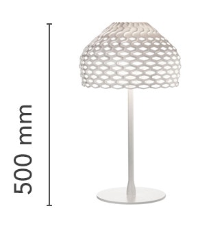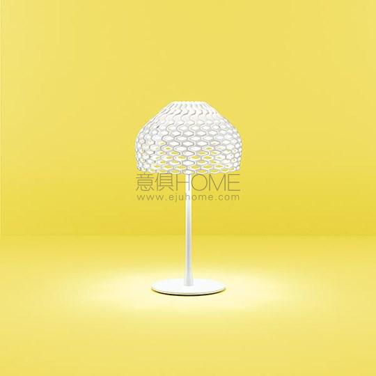 Diffused light table lamp. Exterior diffuser in Polycarbonate. Internal diffuser in injection printed opal polycarbonate. Support and base in painted steel.