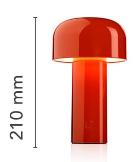 Rechargeable direct light table lighting device. Base and dome in coloured PC. Diffuser in Opaline injection moulded photo-engraved PC. 24-hours' autonomy, charging via Micro-USB-C. Push-button switch positioned on the base provides the 4-step dimmer function. Battery status indicator positioned under the base. USB-C charging cable included, useful length 120cm. USB battery charging on plug with interchangeable plugs