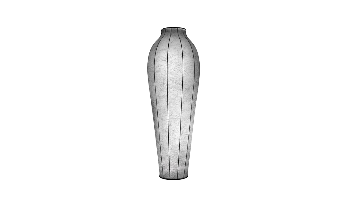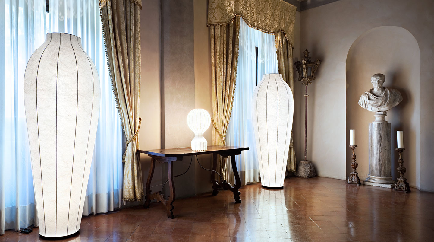 Floor lamp providing diffused light. Internal structure in steel. Cocoon diffuser coated on the structure with transparent protection at the end of the manufacturing process. Base in injection printed ABS. Frieze in silk-screened glass placed at the top end of the reflector obtained by spinning. The ON/OFF functions of the two light sources are by means of dual pedal switch mounted on power cable. The fluorescent tube can be dimmed, conserving the memory of the last setting before turn-off. The second button turns on/off the top lamp for the projection of the decorative frieze on the ceiling. Power cable of useful length 285 cm.