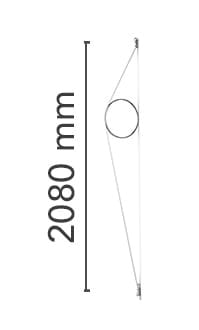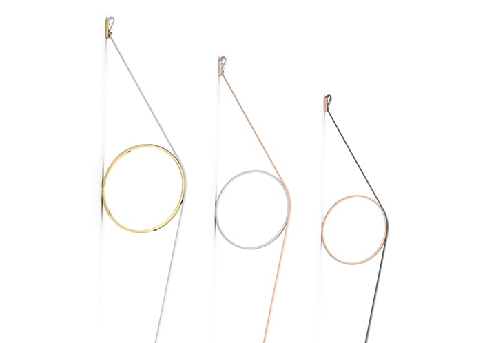 Indirect light wall lighting device with body in calendered, extruded aluminium with galvanised or varnished finish. The special tangent cable, in coloured rubber, provides the power. The cable is fixed to the wall with ABS joints in the same finish as the ring. Dimming via switch pedal on the cable. Power supply on adapter with interchangeable plugs. Useful cable length is 2.5 metres.