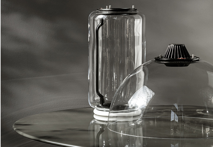 Standing lamps consisting of interconnecting glass modules reaching a height of 2,17 metres (85.43"). Cylindrical and semi-spherical transparent blown glass structure, die cast aluminium base and rings, hydroformed steel internal lateral arms and injection moulded optical opal silicone outer ring diffusers. The power supply cable is 2 metres (78.74") long, with a pedal operated panel used as a dimmer to adjust the light intensity by 10% to 100% in either direction. Wall mounted power supply unit with interchangeable plugs.