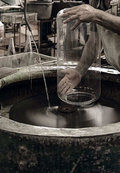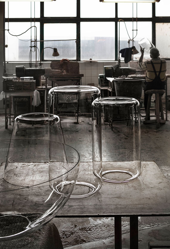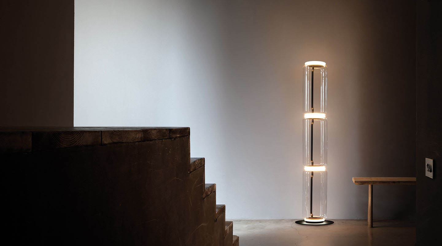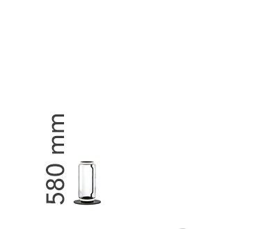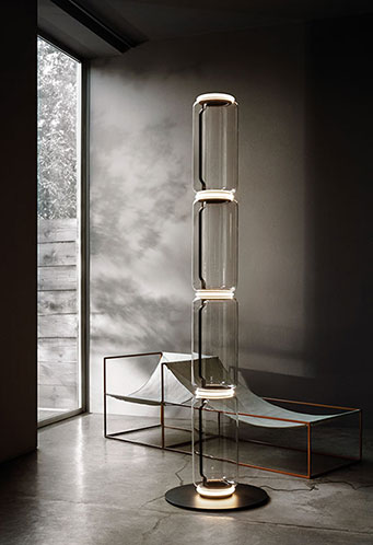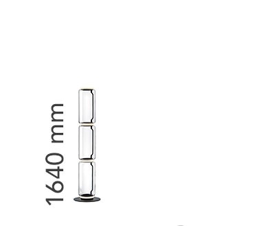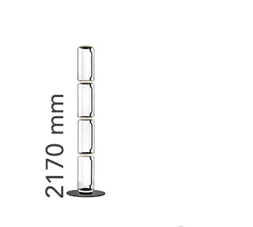Standing lamps consisting of interconnecting glass modules reaching a height of 2,17 metres (85.43"). Cylindrical and semi-spherical transparent blown glass structure, die cast aluminium base and rings, hydroformed steel internal lateral arms and injection moulded optical opal silicone outer ring diffusers. The power supply cable is 2 metres (78.74") long, with a pedal operated panel used as a dimmer to adjust the light intensity by 10% to 100% in either direction. Wall mounted power supply unit with interchangeable plugs.
