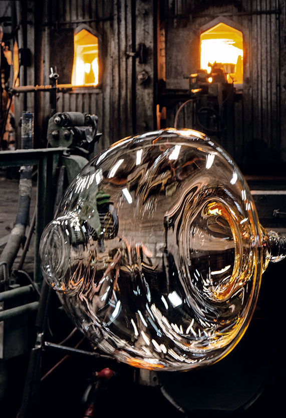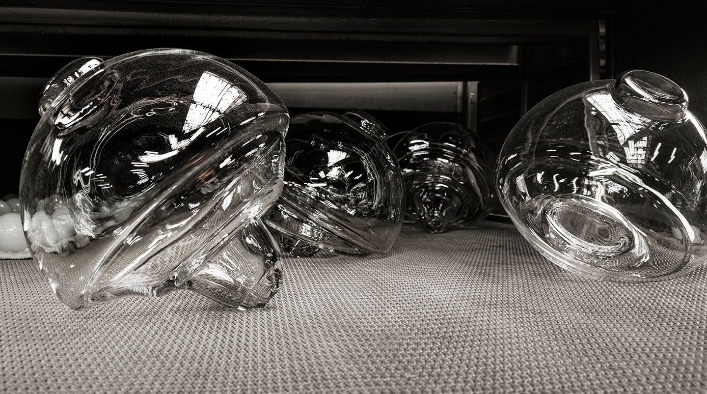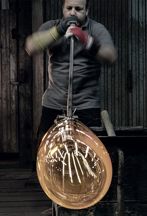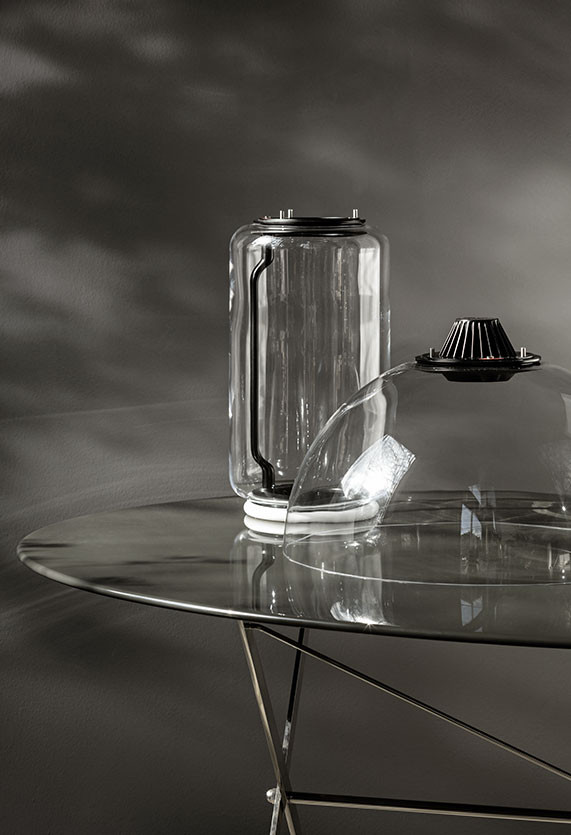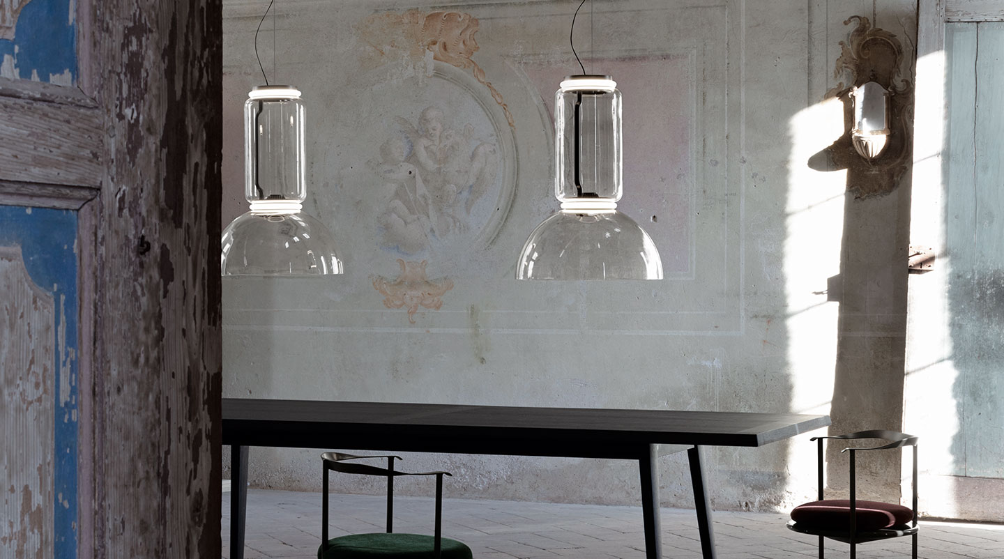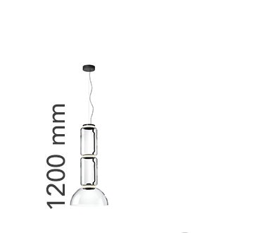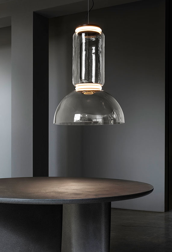 Hanging lamps consisting of interconnecting glass modules reaching a length of 3,2 mt. (126.77") with 4 mt. (157.48") suspended power cable. Cylindrical and semi-spherical transparent blown glass structure, suspended die cast aluminium ring connector, hydroformed steel internal lateral arm and injection moulded optical opal silicone outer ring diffusers. The power supply unit within the ceiling rose can be used as a dimmer to adjust the light intensity by 10% to 100% in either direction by means of the 0-10/1-10V, PUSH, DALI control.