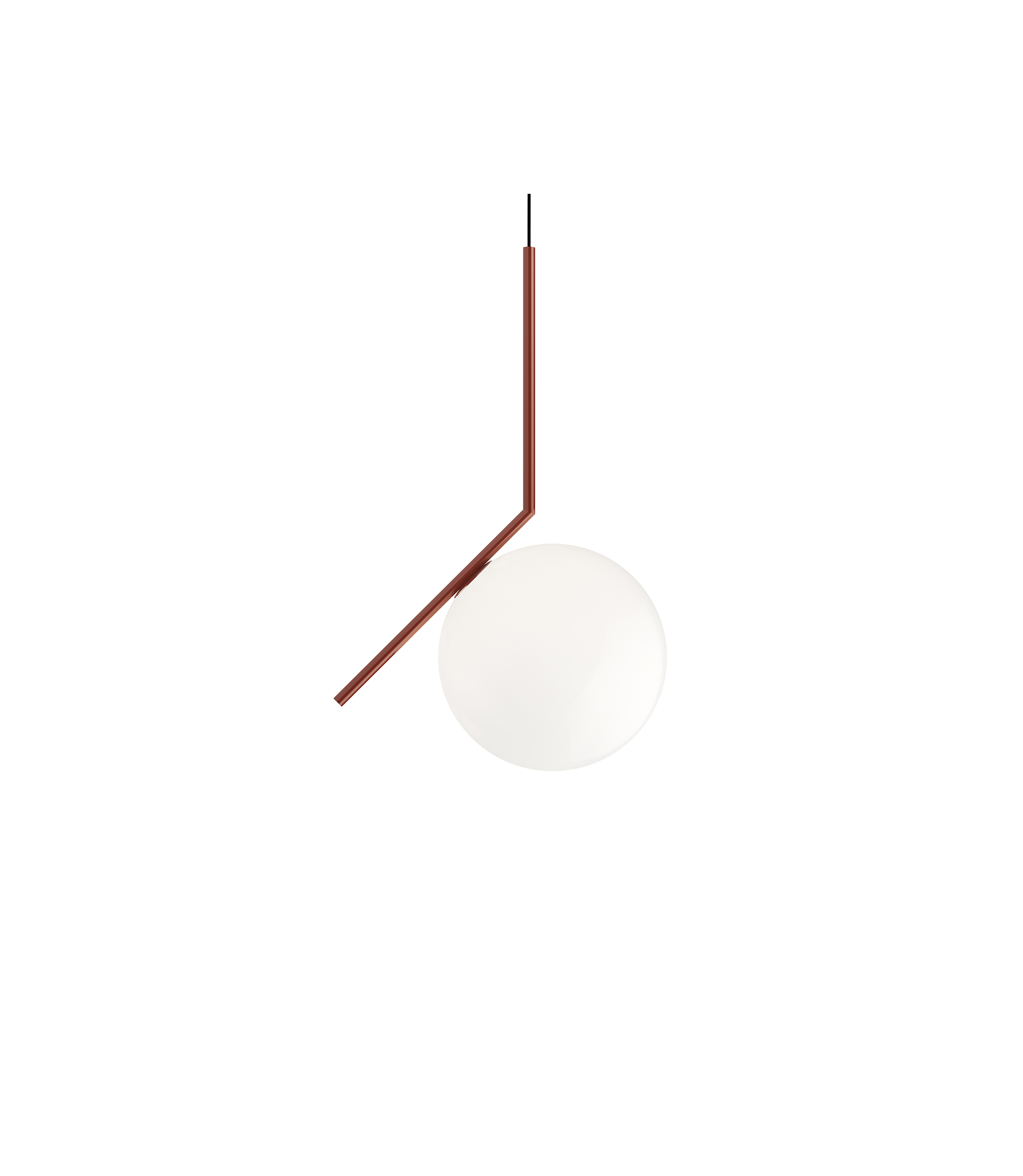 uspension lamp providing diffused light. Frame in brass, brushed and transparent varnished or chrome steel. Blown glass opal diffuser.