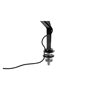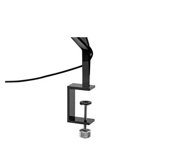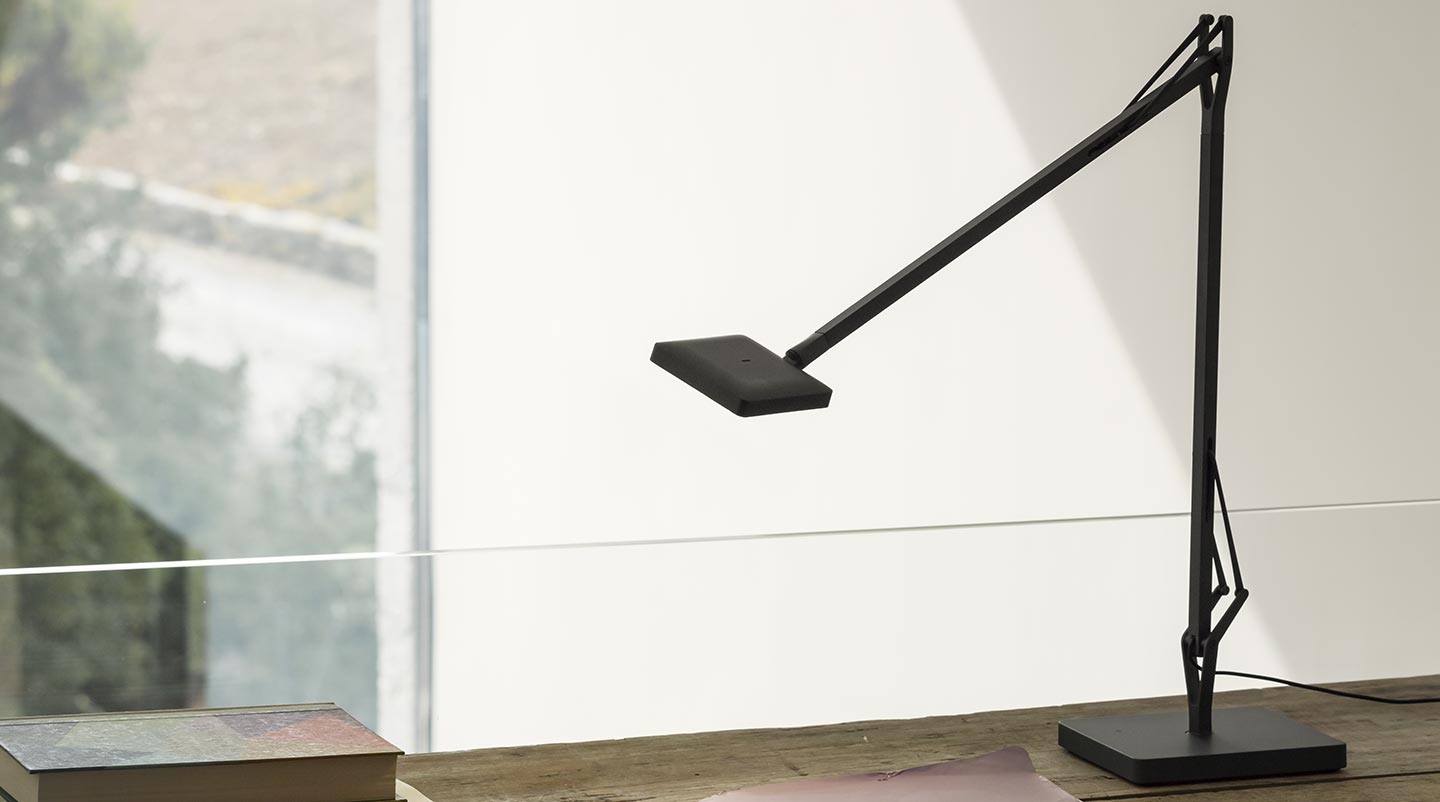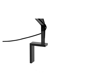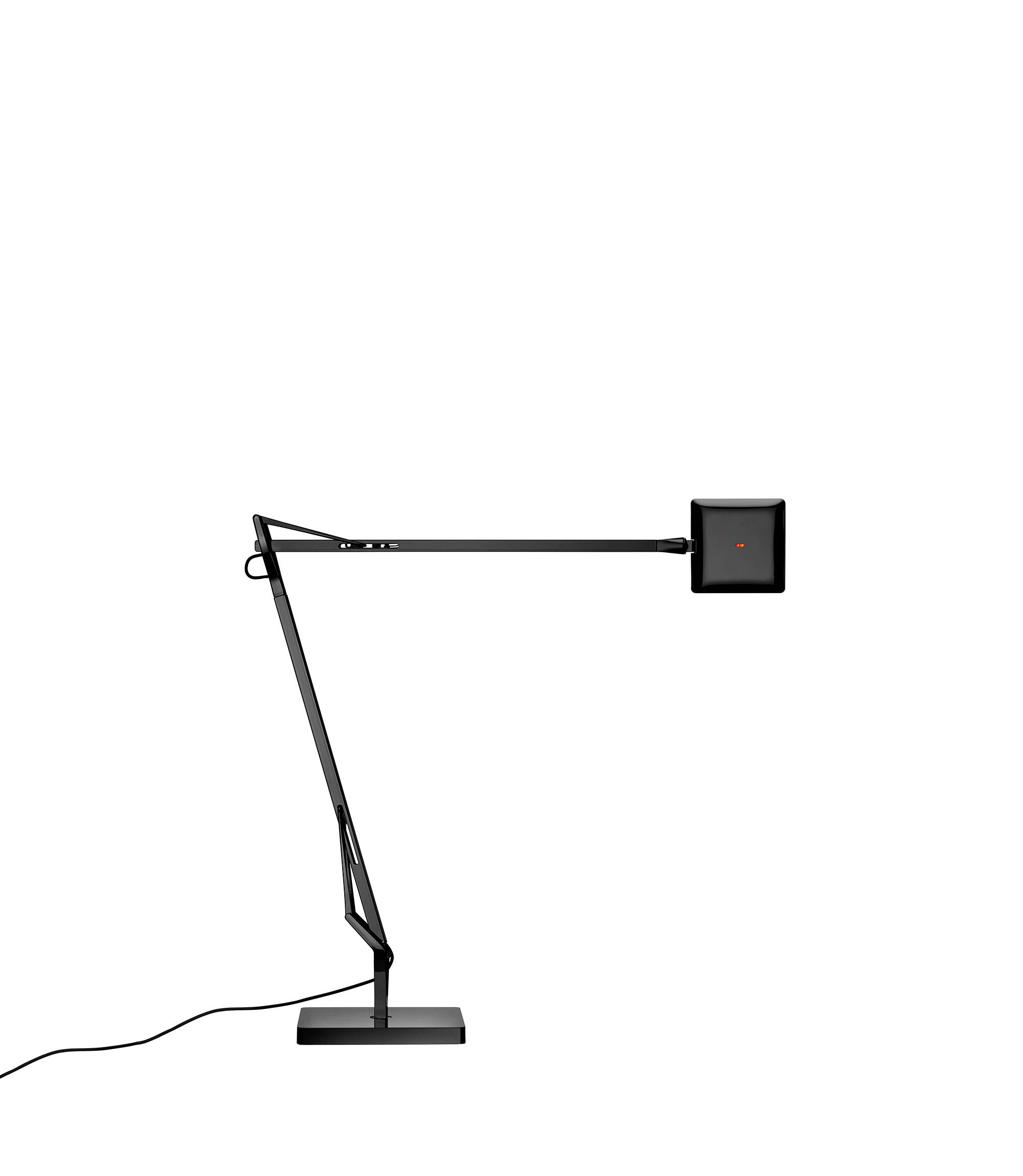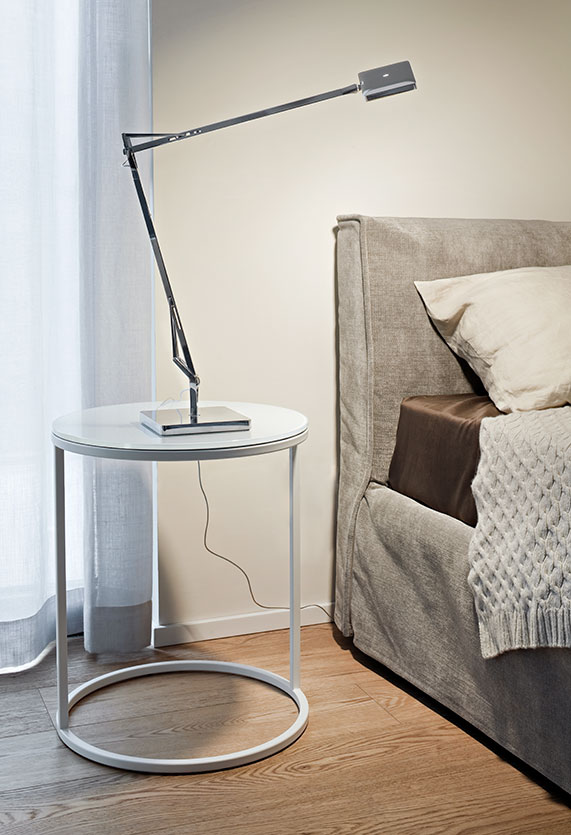 Adjustable table lamp providing direct light. Aluminium painted or chromed body, with die cast head, joints and forks, and extruded arms.  Diffuser in photoengraved polycarbonate and aluminate on the perimeter. Edge Lighting technology light source. Optical switch sensor placed on the head that provide 3-step dimming function and color temperature adjustment at 2700K or 3200K. Power cord length 150 cm. Plug-in power supply with interchangeable plugs.