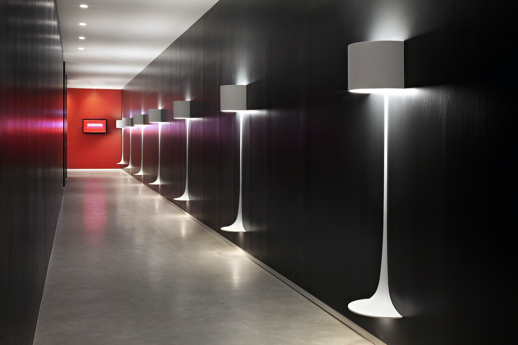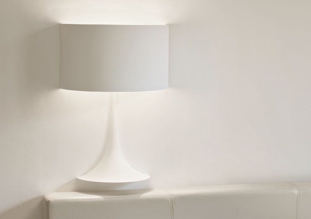 Lamp designed for minimal visual impact that is flush mounted to plasterboard walls. Available with halogen light sources connected directly to mains, fluorescent and LED lights sources. All of them include opal safety glass.
